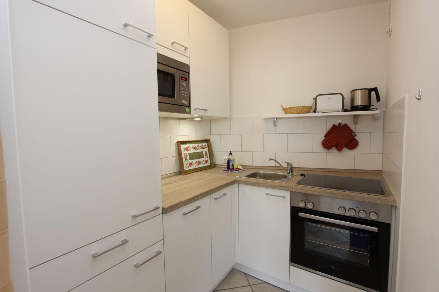 Die separate Einbauküche ist mit einem Cerankochfeld, Backofen, Spülmaschine, Mikrowelle, Kühlschrank mit Gefrierfach, Wasserkocher, Kaffeemaschine und einem Toaster ausgestattet.