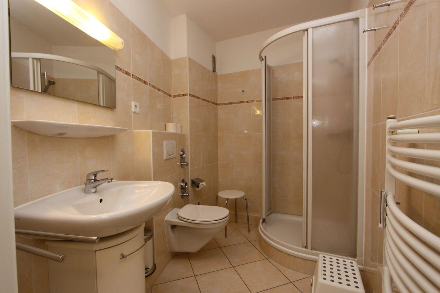 Das Badezimmer hat eine Runddusche, ein WC, einen Spiegel, ein Waschbecken mit einem Unterschrank sowie eine Handtuchheizung.