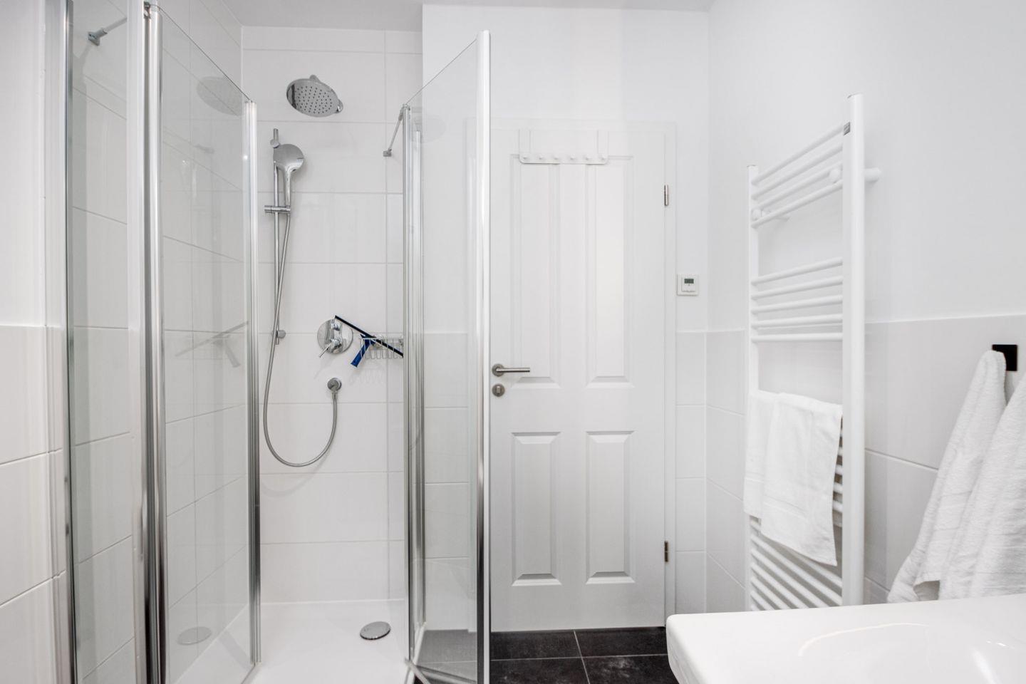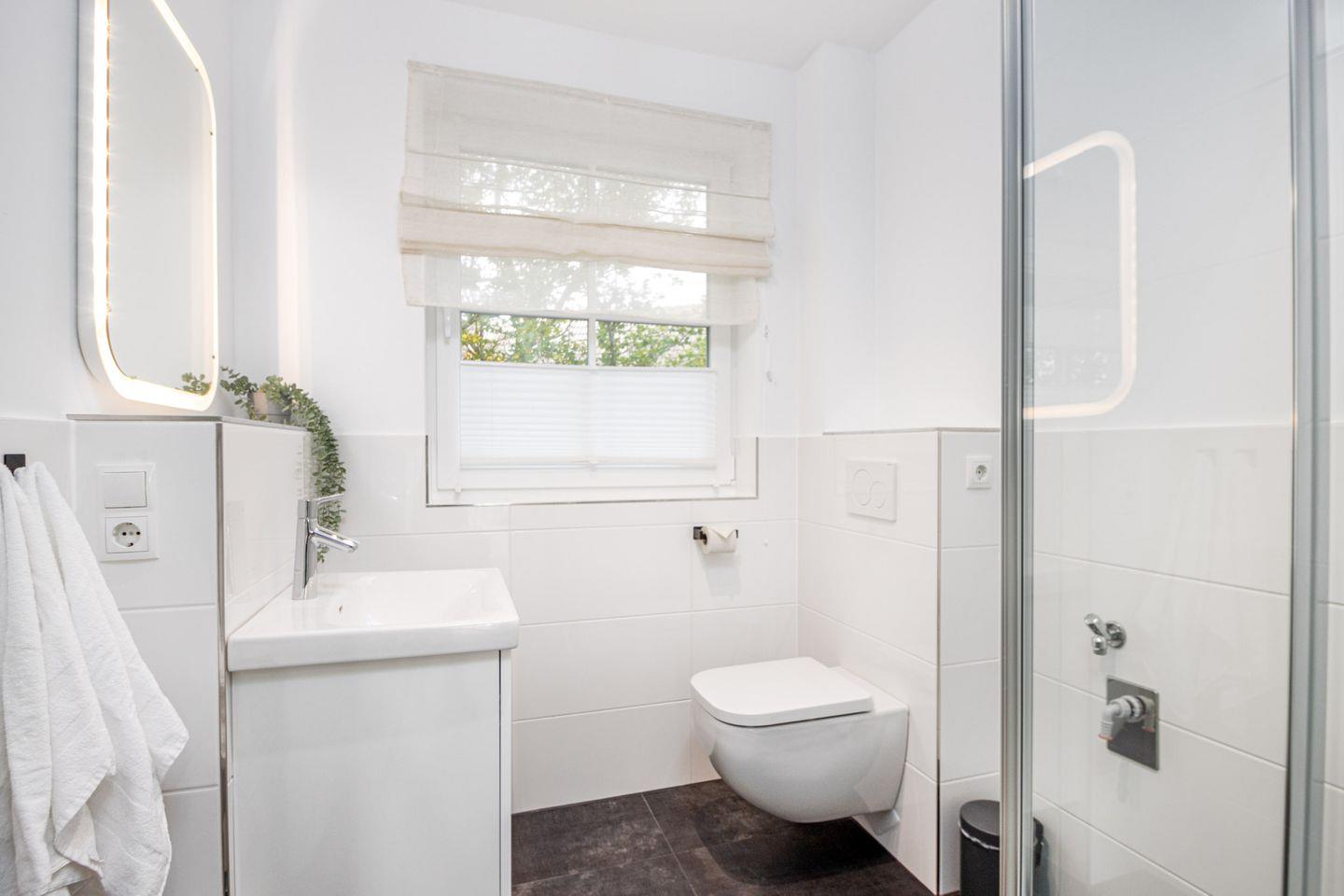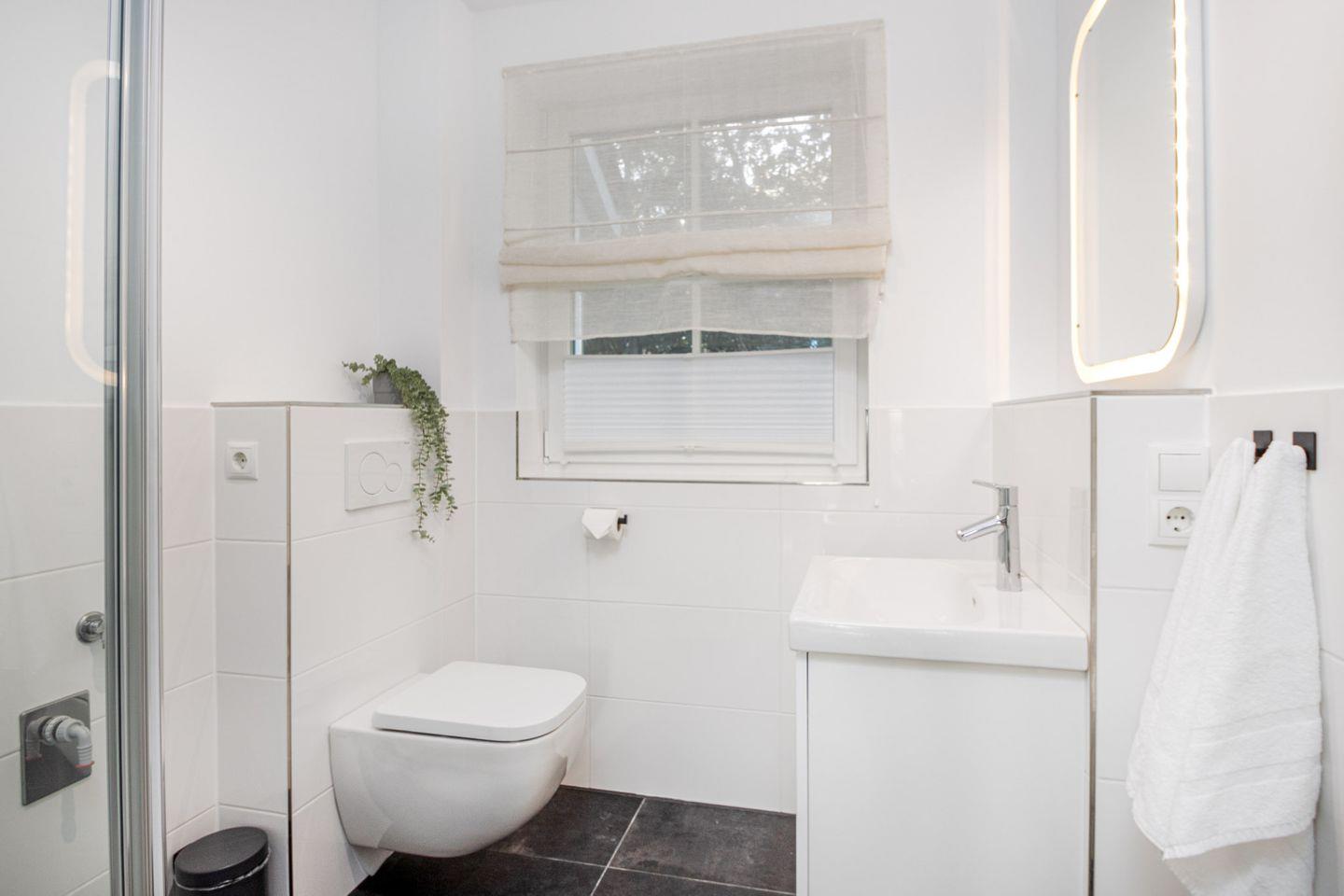 Das Badezimmer bietet eine Echtglas-Duschkabine mit Rainshower-Funktion, ein WC, einen Waschtisch, einen beleuchteten Spiegel und ein Fenster für eine angenehme Atmosphäre.