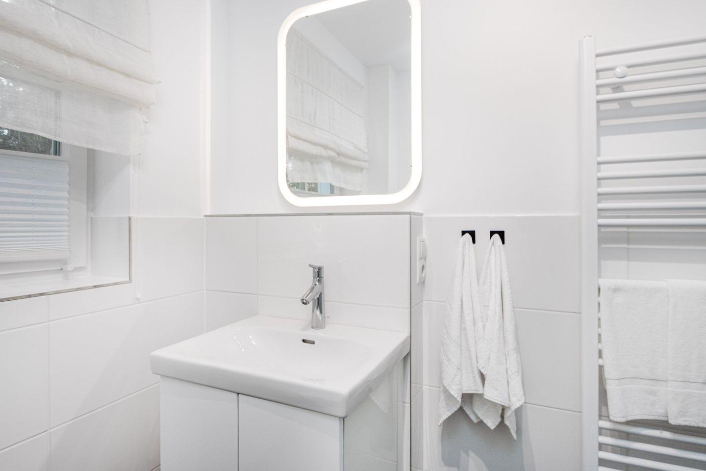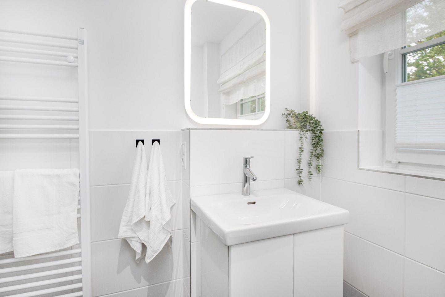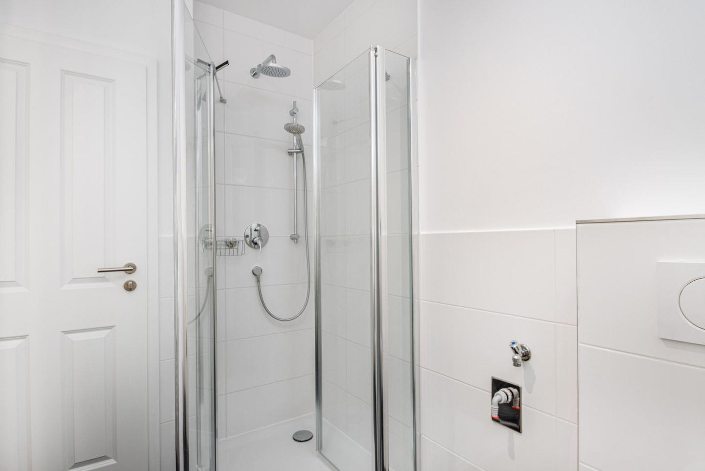 Das Badezimmer bietet eine Echtglas-Duschkabine mit Rainshower-Funktion, ein WC, einen Waschtisch, einen beleuchteten Spiegel und ein Fenster für eine angenehme Atmosphäre.
