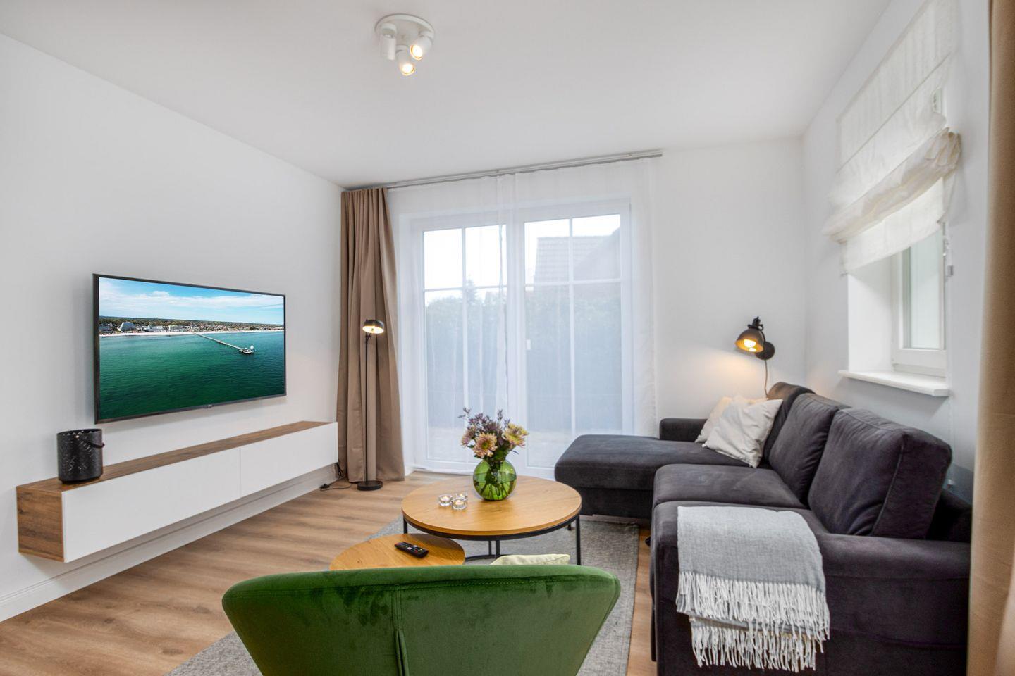 Im Wohnzimmer lädt eine komfortable Schlafcouch (140x200 cm Liegefläche) dazu ein, sich zu entspannen und Ihre Lieblingssendungen auf dem Smart-TV zu genießen. Ein gemütlicher Sessel ergänzt den Raum perfekt. Der Essbereich bietet Platz für 4 Personen und ist ideal für gemeinsame Mahlzeiten geeignet.