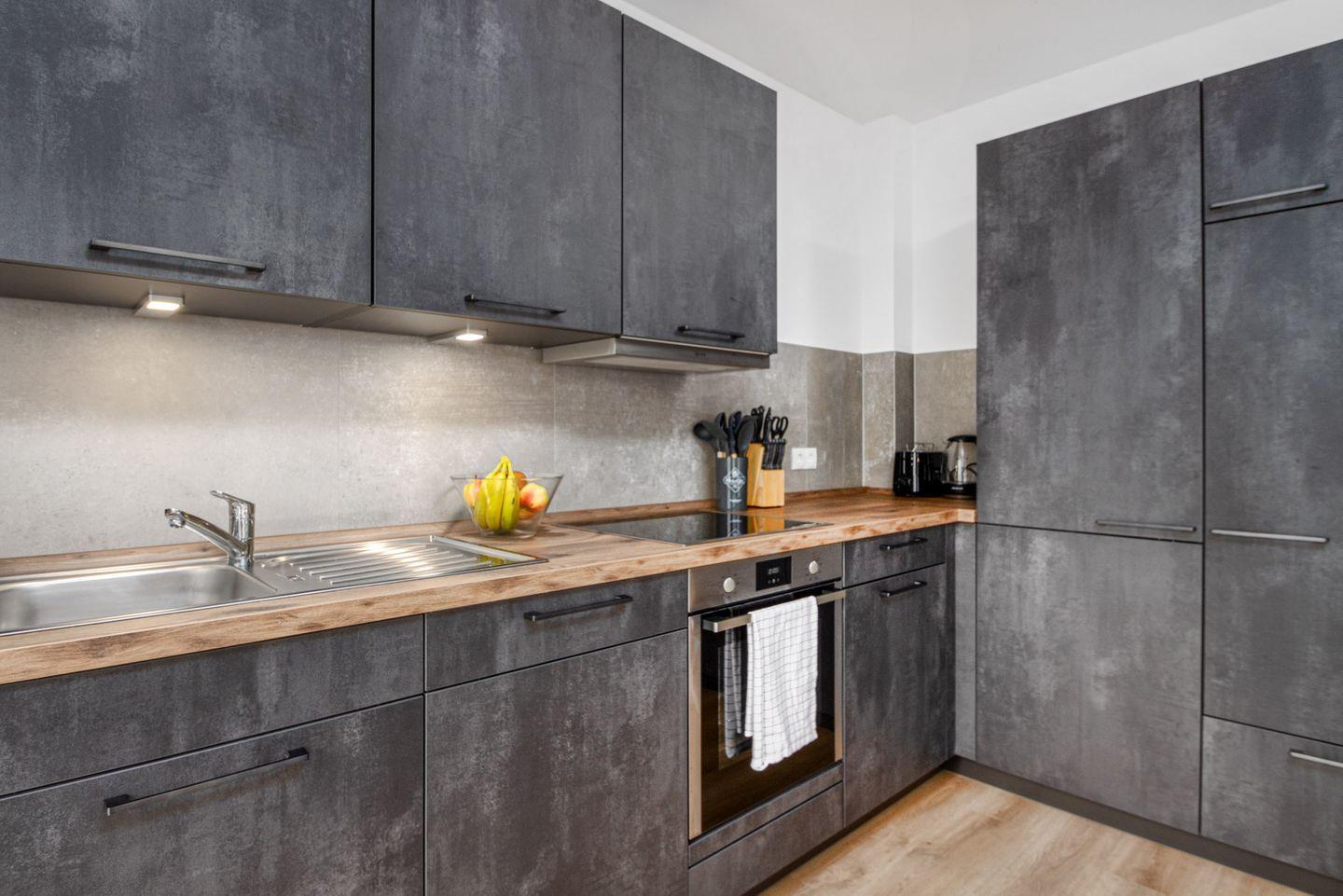 Die offene Küche ist komplett ausgestattet mit einem Induktionskochfeld, Backofen, Spülmaschine, Kühlschrank mit Gefrierfach, Wasserkocher, Toaster und Kaffeemaschine.