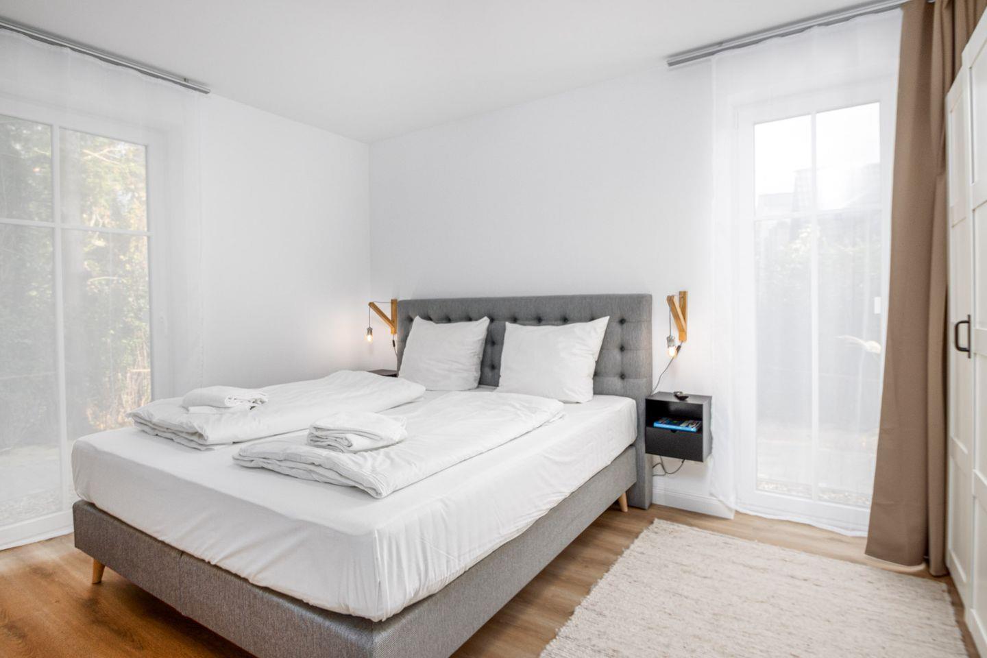 Das Schlafzimmer verfügt über ein luxuriöses Boxspringbett mit einem durchgehenden Topper (180x200 cm Liegefläche), einen Kleiderschrank, einen Smart-TV und Verdunkelungsgardinen, die für erholsame Nächte sorgen.