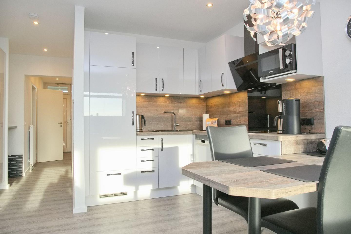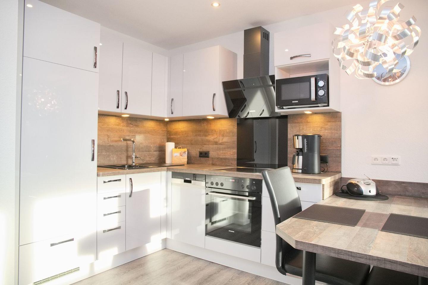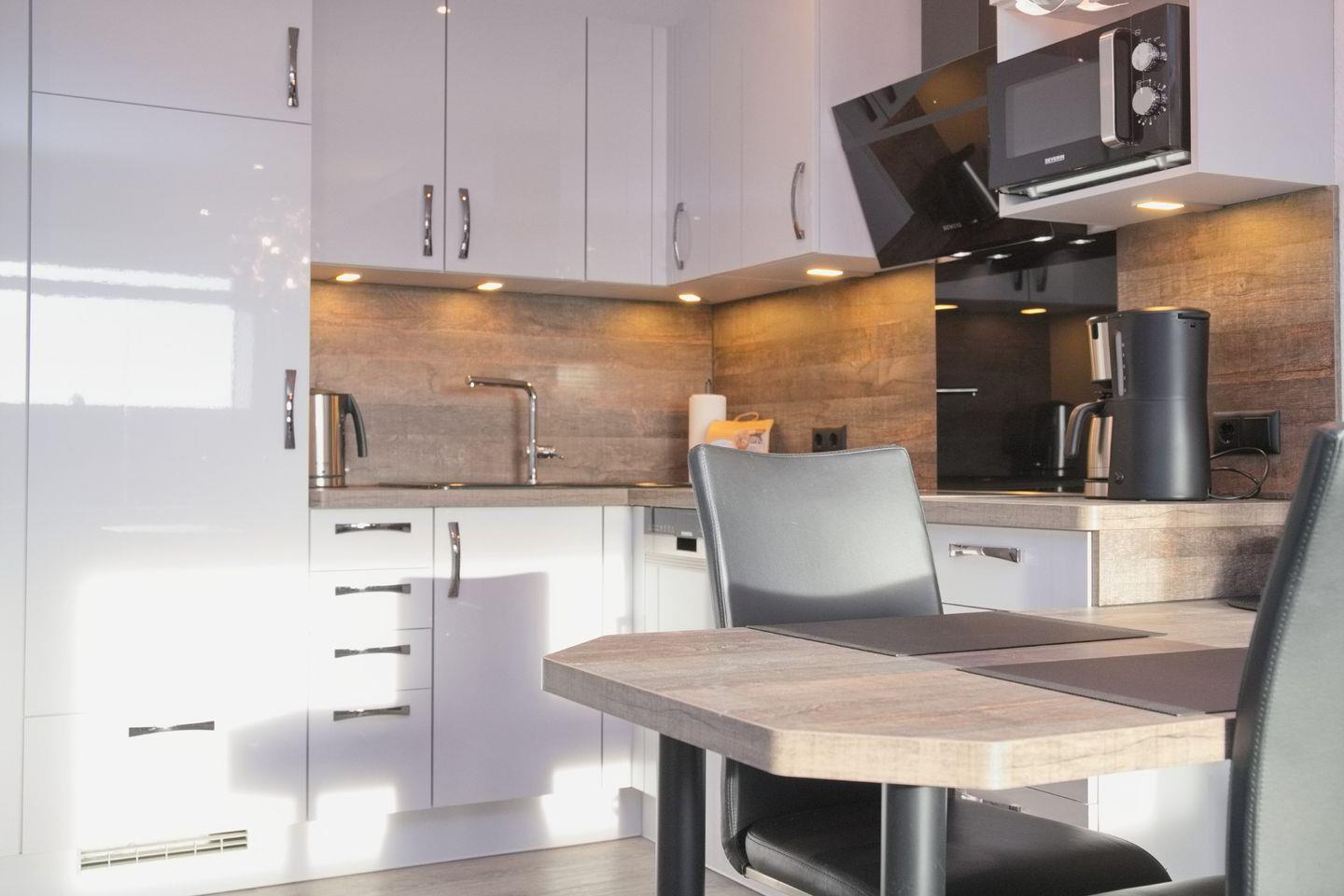 Das gemütliche Wohnzimmer ist mit einer komfortablen Mikrofaser-Couch und einem modernen TV ausgestattet. Die offene Küche bietet alles, was Sie für die Zubereitung leckerer Mahlzeiten benötigen: einen Geschirrspüler, eine Mikrowelle, ein Cerankochfeld mit Backofen sowie einen Kühlschrank mit 3*-Gefrierfach. Praktische Küchenhelfer wie eine Filterkaffeemaschine, ein Wasserkocher und ein Toaster sind ebenfalls vorhanden.