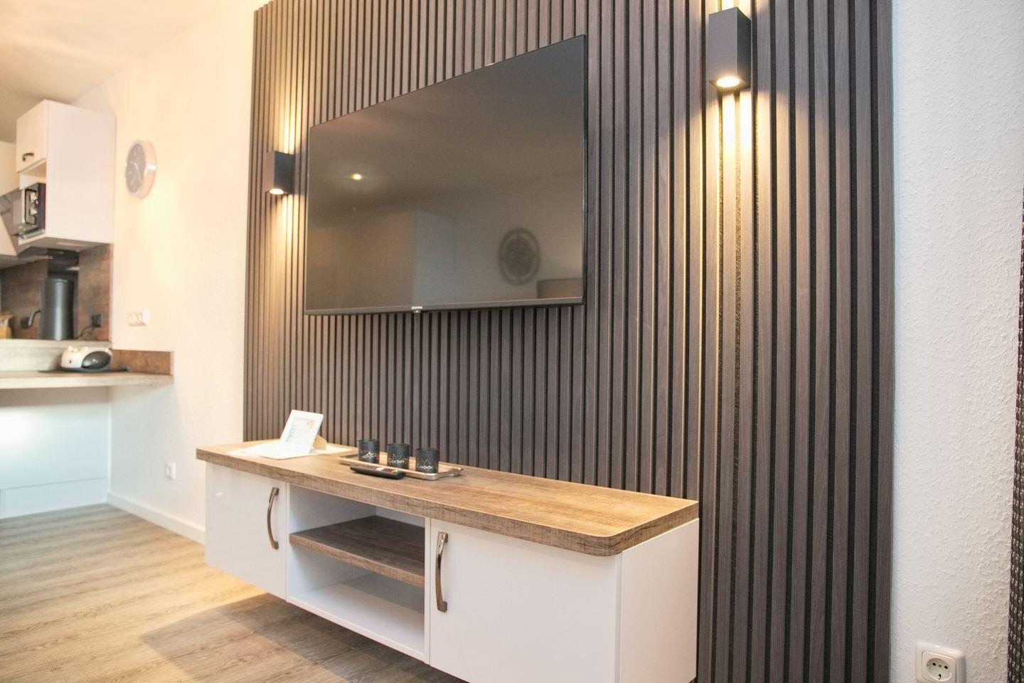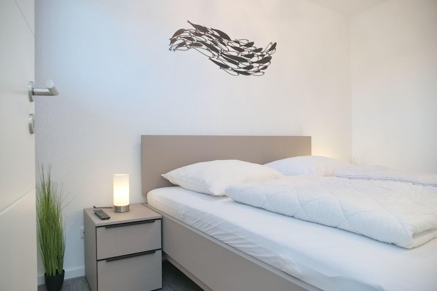 Das Schlafzimmer lädt mit einem bequemen Doppelbett und Außenrollläden zu erholsamen Nächten ein. Ein zusätzlicher Fernseher sorgt für Unterhaltung direkt im Schlafzimmer. Das moderne Duschbad, mit Rainshower, ist mit einem WC, einem Waschtisch und einem beleuchteten Spiegel ausgestattet.