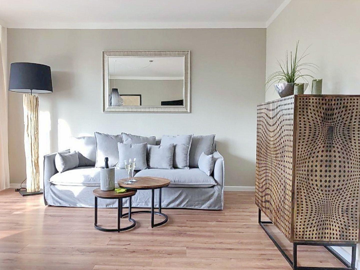 Die Wohnung ist ausgestattet für zwei Erwachsene und verfügt über einen komplett ausgelegten Vinylfußboden in Eiche-Natur-Optik, der Wohn-/Essbereich ist ausgestattet mit einem Esstisch in Natureiche mit 4 Stühlen, gemütlichem Hussensofa, sowie einem High- und Lowboard. Fürs Entertainment sorgt ein 50“ Smart-Flach-TV mit Soundbar und eine moderne Musikanlage (Bluetoothfähig).