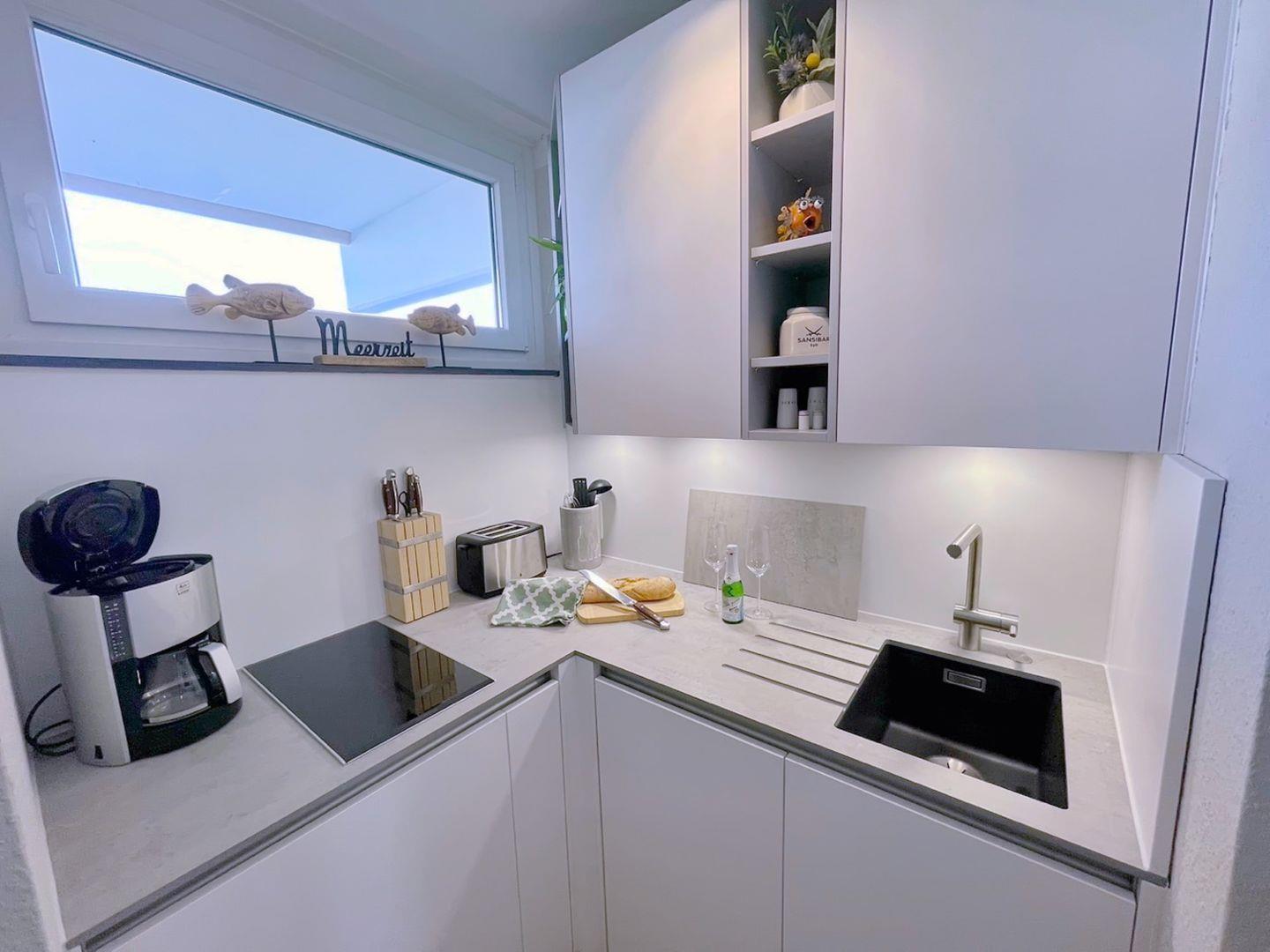 Die in 2023 neu eingebaute Küche verfügt über einen Kühlschrank mit Gefrierfach, Geschirrspüler, Induktionskochfeld (2-Platten), Mikrowelle, sowie Toaster und Wasserkocher.