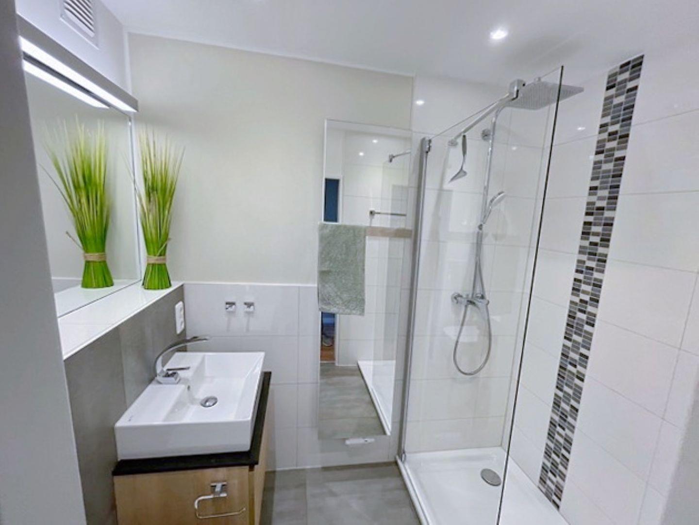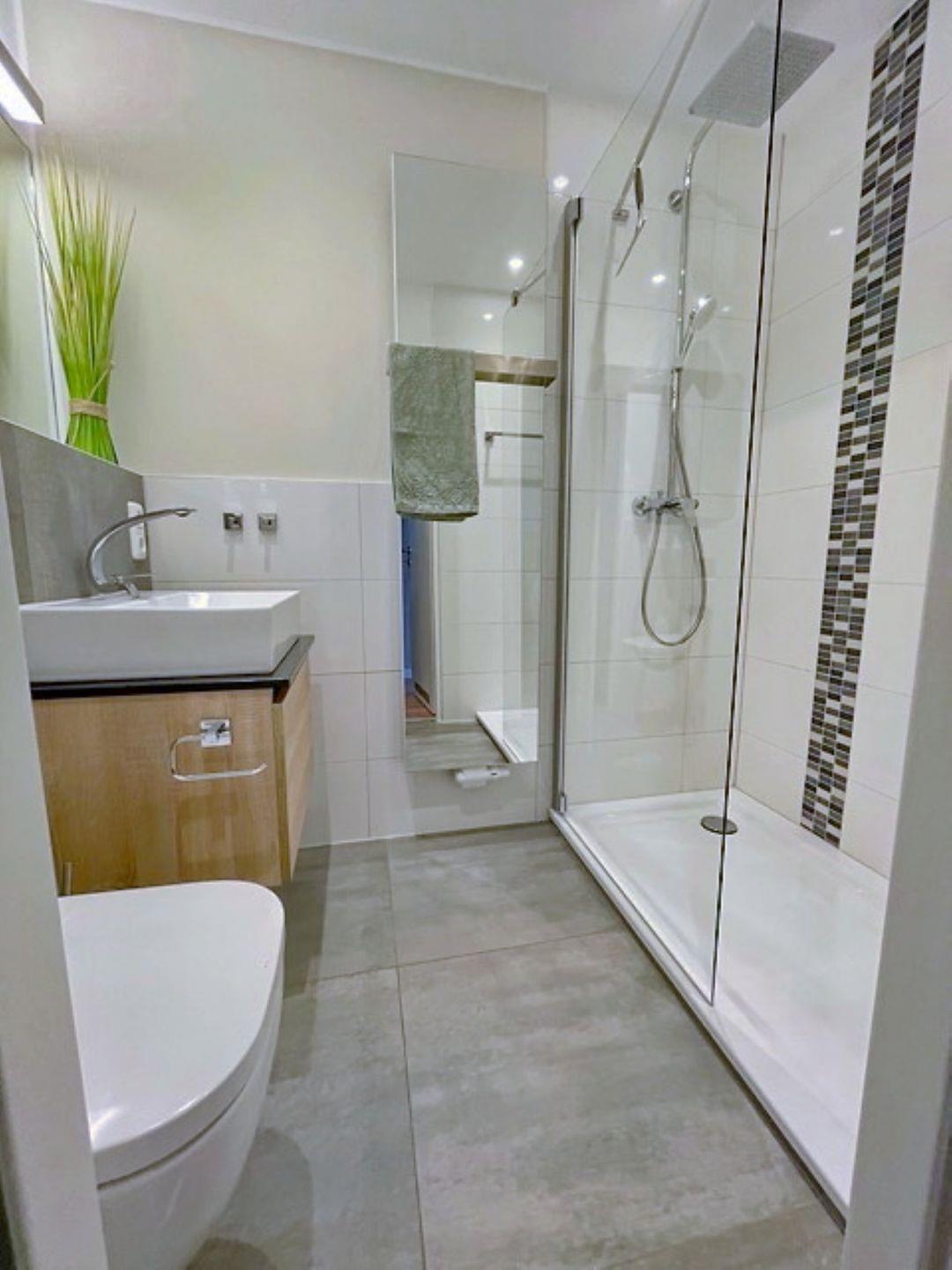 Das exklusiv neu gestaltete Bad mit Fußbodenerwärmung in Beton-Optik ist mit einem Waschtisch, einer bodentiefen Walk-In-Dusche (140x80 cm) mit Regenshower, einem Spiegelheizkörper und Fön ausgestattet.