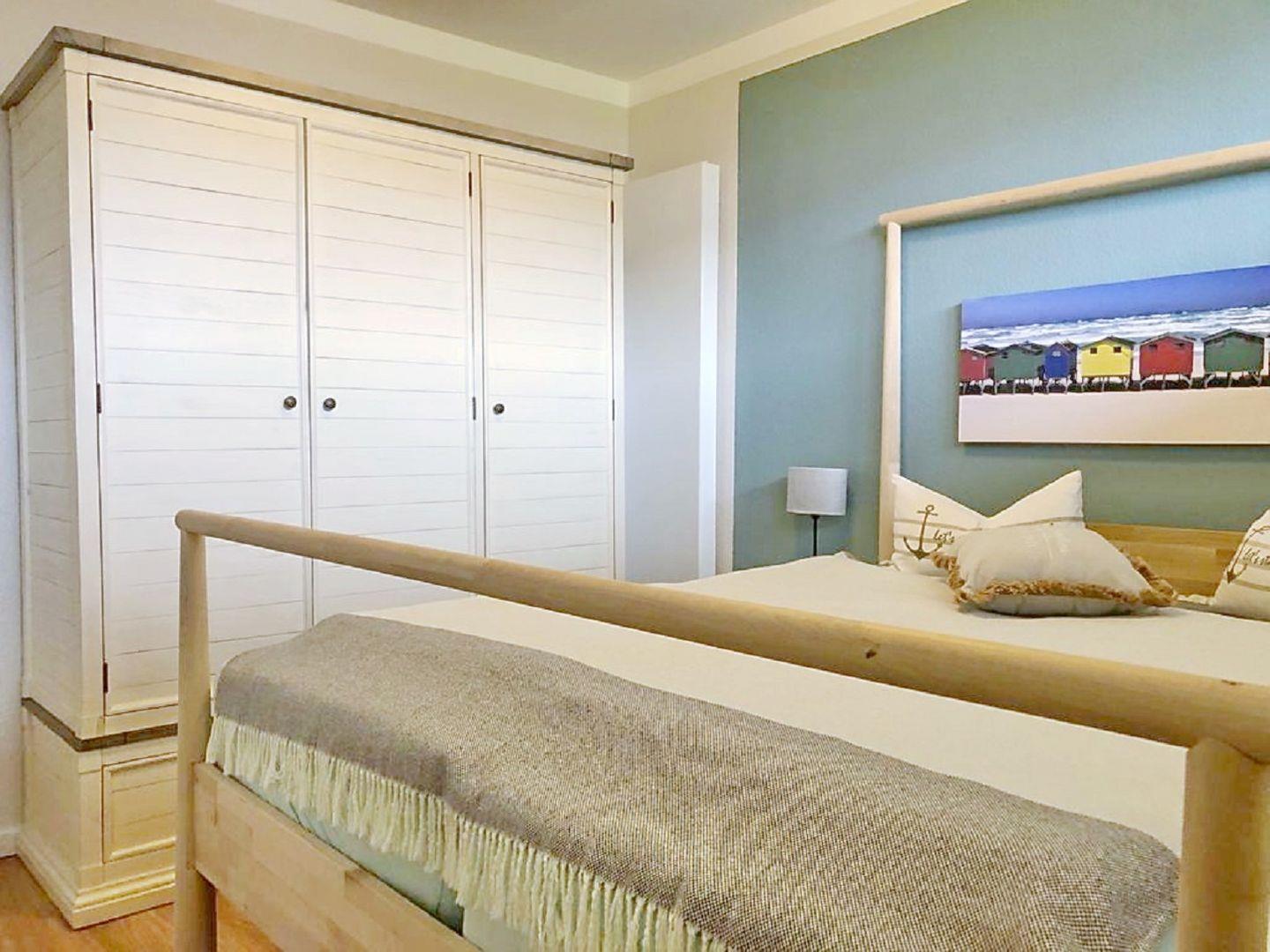 Das im Beach-House designte Schlafzimmer ist mit einem extra hohen Doppelbett (2x80 x 200cm x 70 cm Höhe) für einen angenehmen Ein-/Ausstieg, und einem großzügigen Kleiderschrank ausgestattet. Verdunklungsgardinen sorgen für einen angenehmen Schlaf. Ein Kinderbett passt nicht mit hinein.