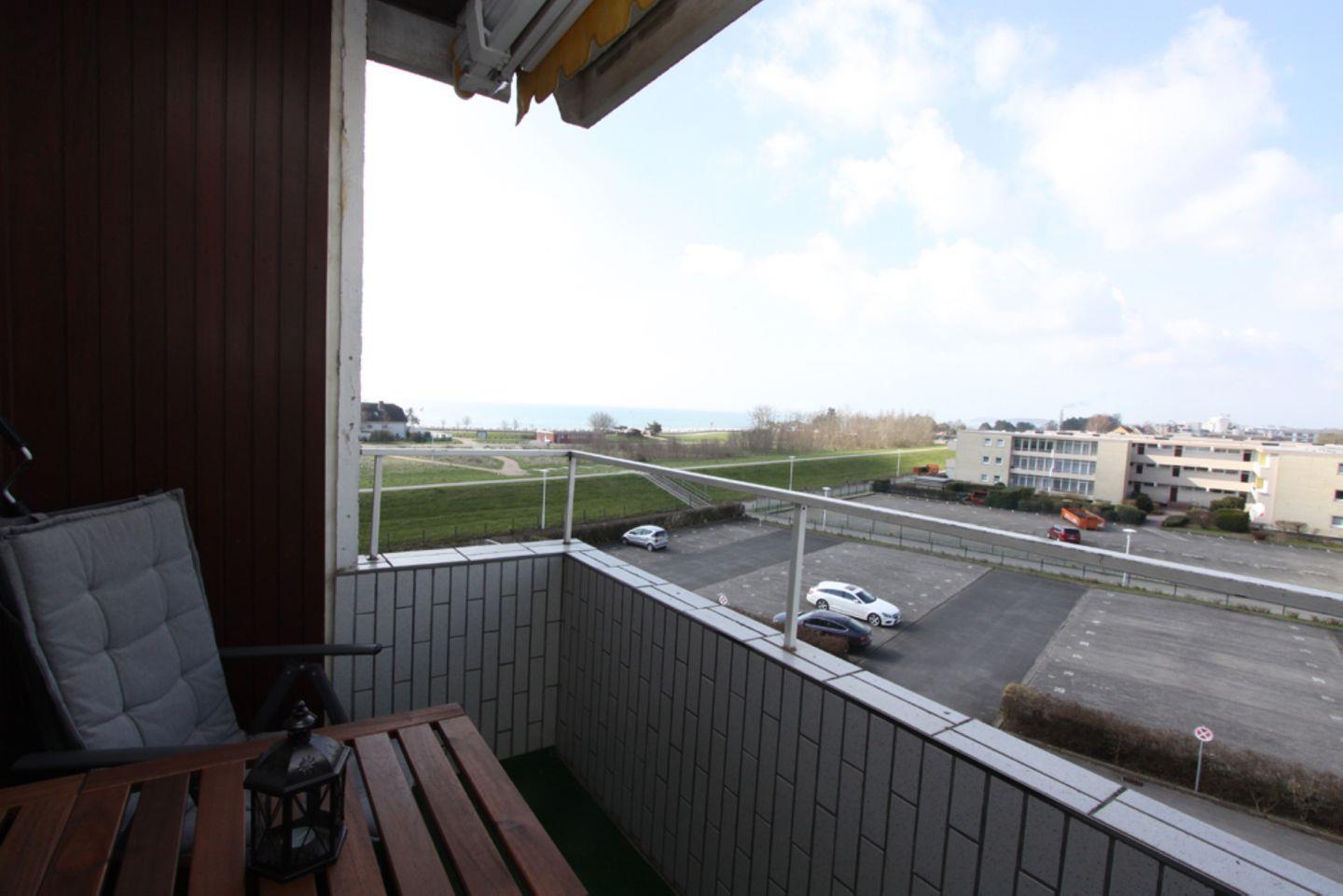 Auf dem Balkon, welcher vom Wohnbereich aus zu begehen ist, haben Sie einen traumhaften Blick in Richtung Seebrücke. Hier können Sie die Abende ausklingen lassen.