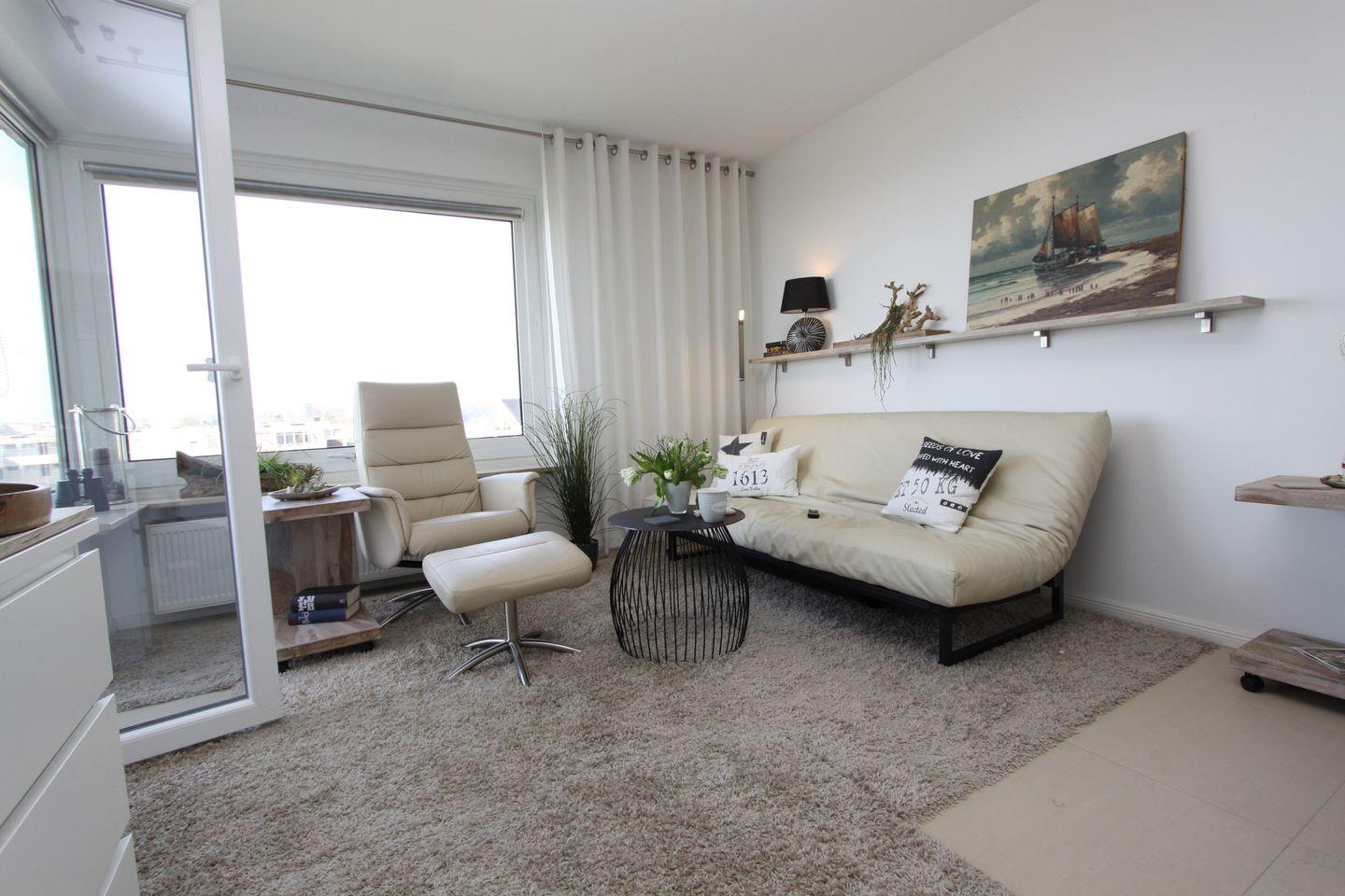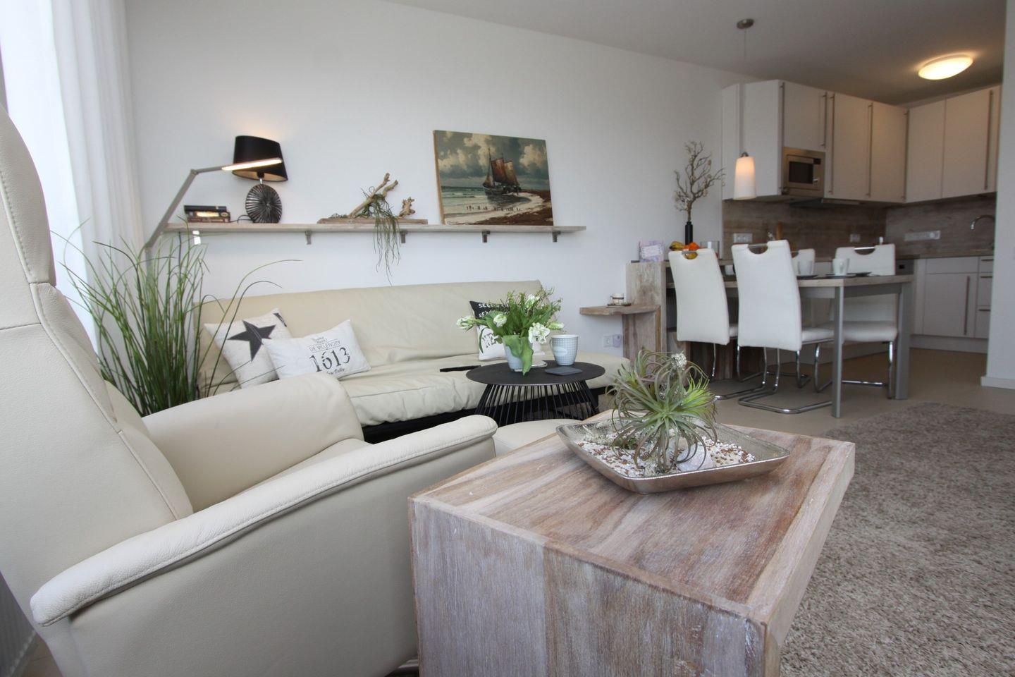 Der gemütliche Wohnbereich besticht mit seiner stilvollen Couch mit Ausrichtung zur See, einem Fernsehsessel mit Beistelltisch und Flach- TV.