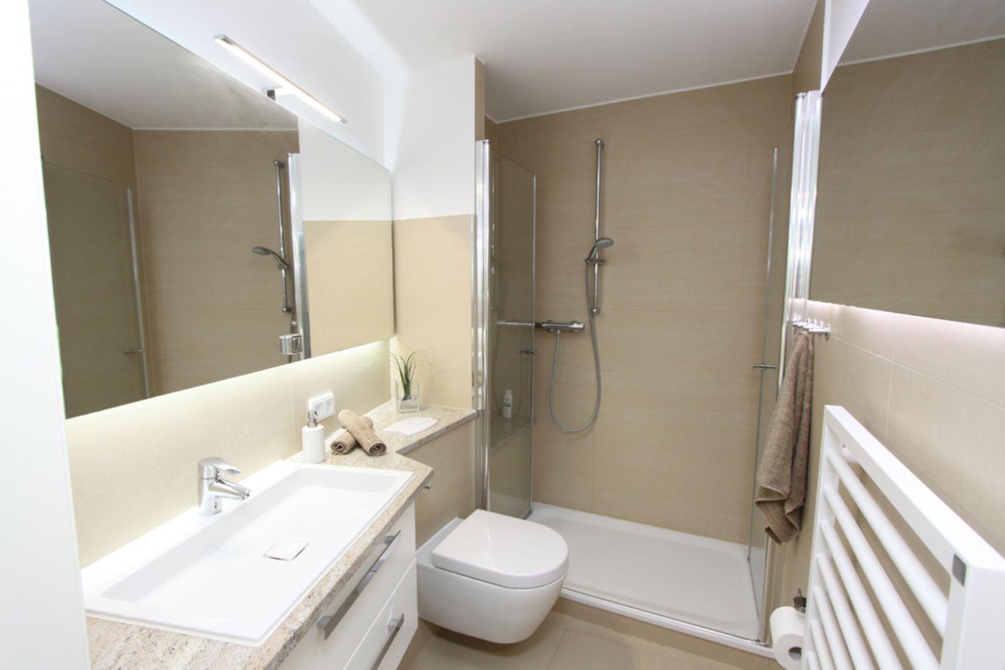 Nach betreten der Wohnung gelangen Sie links in das helle Duschbad mit Waschtisch, WC, Handtuchheizung und großem Spiegel.