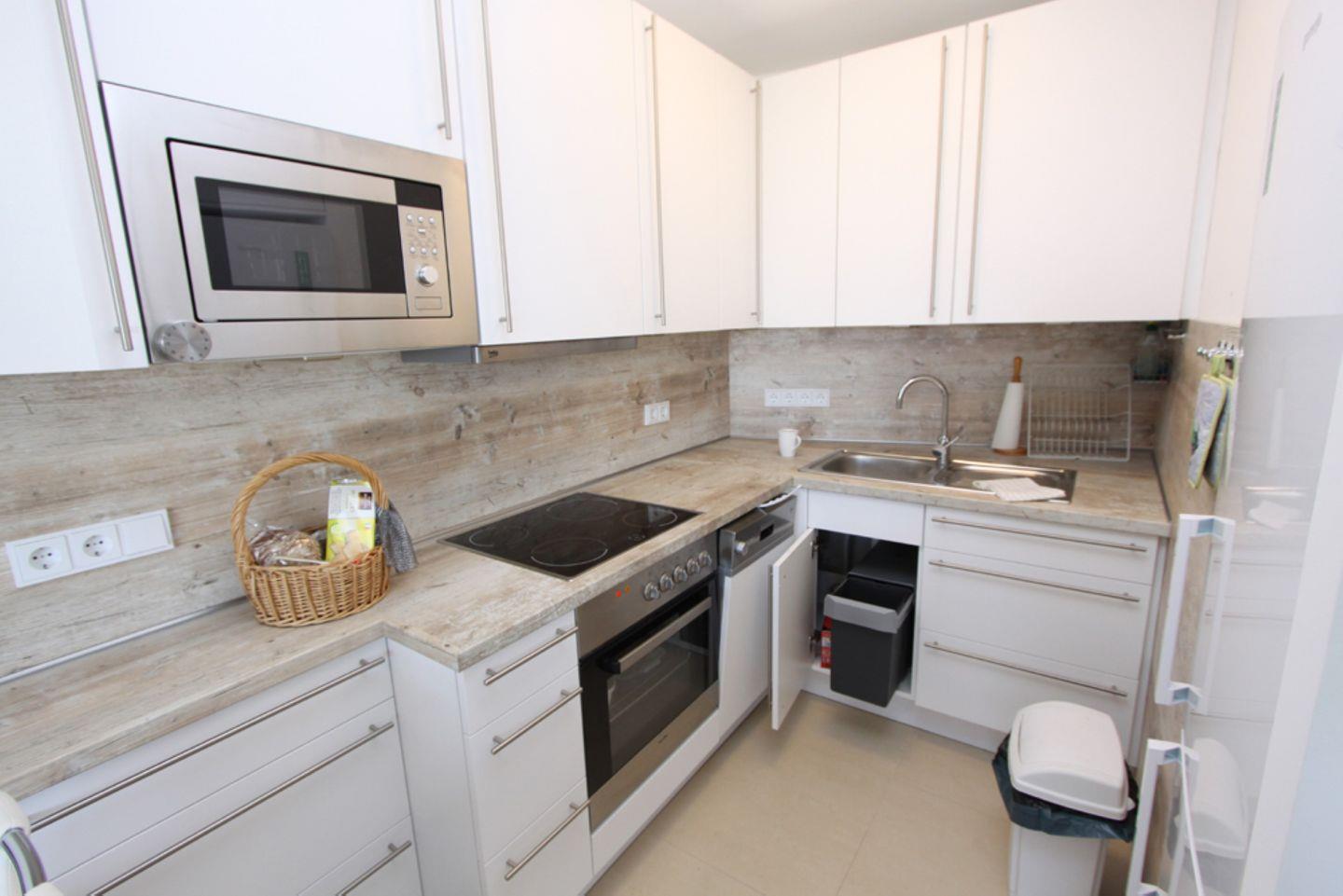 Die stylische Einbauküche verfügt über ein Cerankochfeld, Backofen, Geschirrspülmaschine, Kühlschrank, Gefrierschrank, Mikrowelle, Wasserkocher, Toaster und Kaffeemaschine.