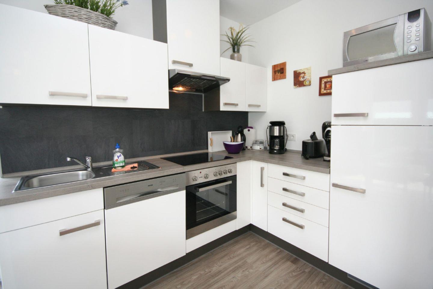 Die offene Einbauküche verfügt über Cerankochfeld, einem Backofen, einer Kühlgefrierkombination, Spülmaschine, Mikrowelle, Wasserkocher, Kaffeemaschine und Toaster.