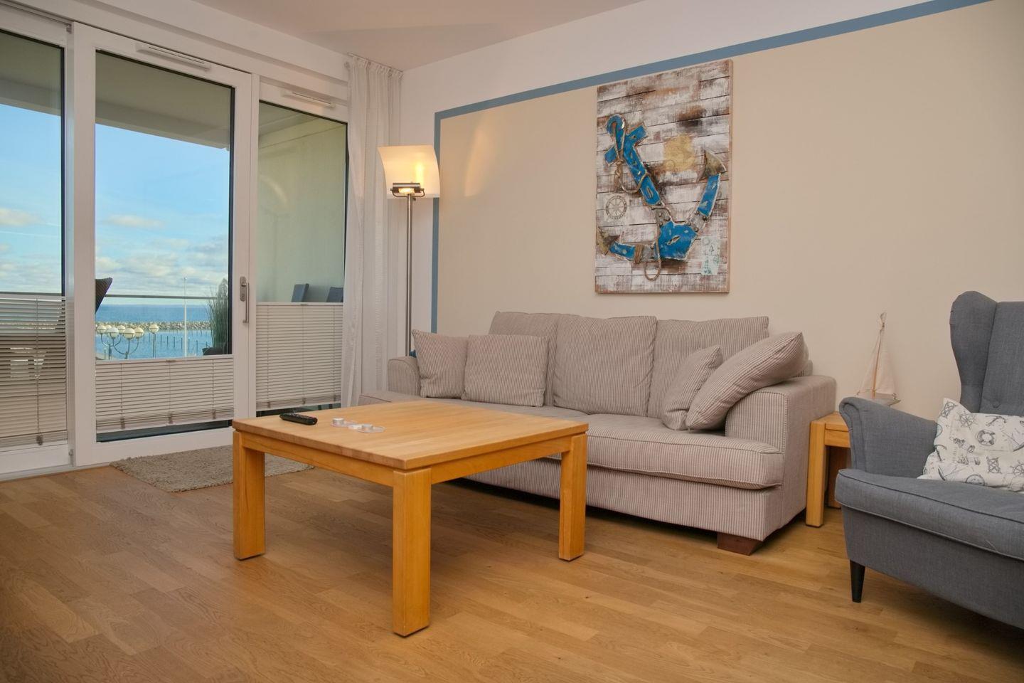 Auf der großen Couch und dem Ohrensessel können Sie dem Wellenschlag zusehen.