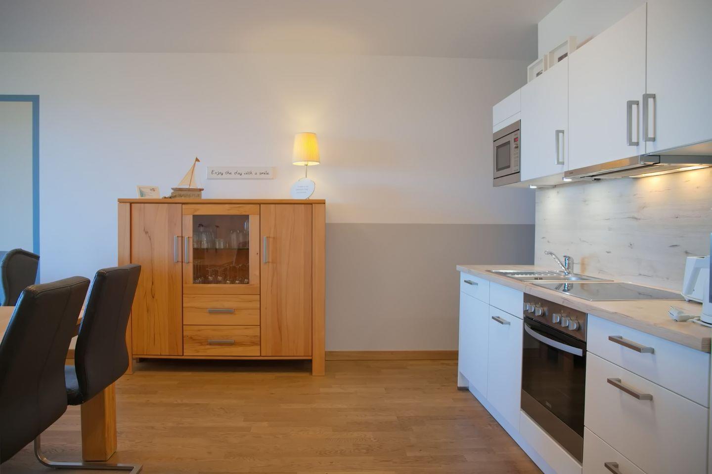 Die offene Einbauküche ist gut ausgestattet mit verfügt über einen Backofen mit Induktionskochfeld, einem Kühlschrank mit Gefrierfach, einen Geschirrspüler, einer Mikrowelle, einem Toaster, einem Wasserkocher und einer Kaffeemaschine.