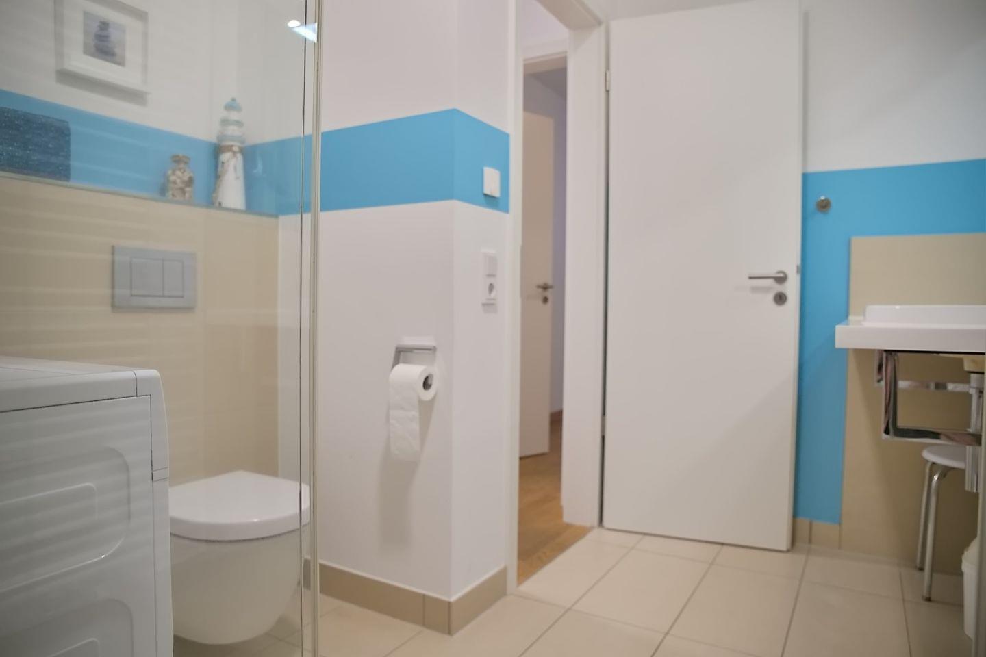 Hier finden Sie das innen liegende Duschbad mit wandhängendem WC, bodengleicher Dusche und Waschtisch. Ein Waschtrockner steht zur allein Nutzung im Bad.