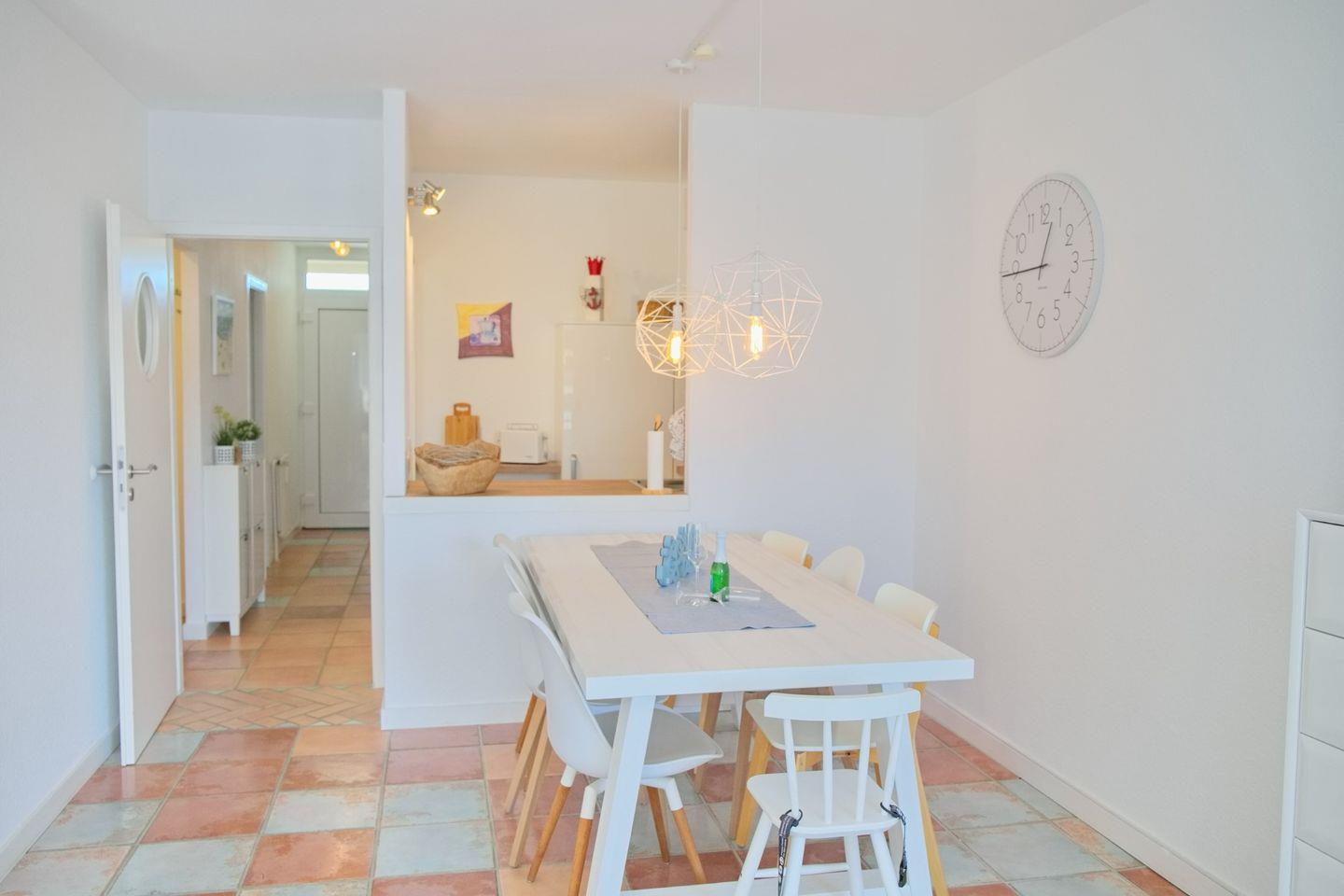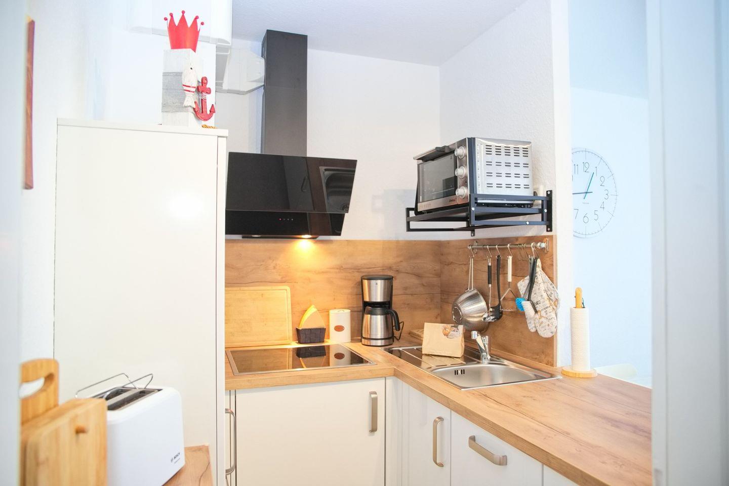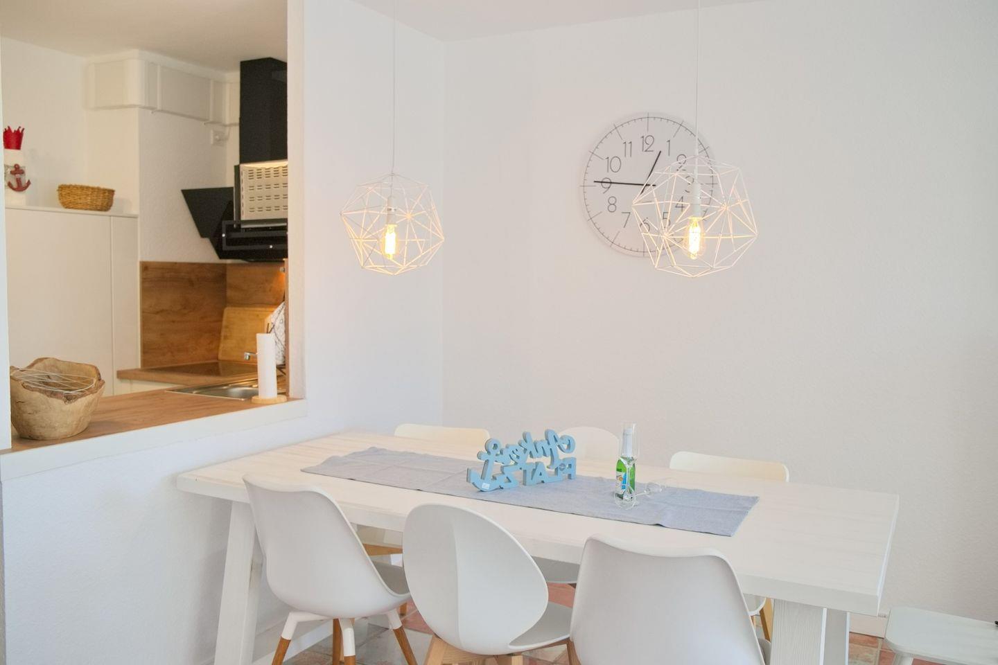 Das Appartement überzeugt mit zwei gemütlichen Schlafzimmern, die insgesamt Platz für bis zu vier Personen bieten. Der offene Wohnbereich ist stilvoll gestaltet und umfasst eine moderne Küche, die mit hochwertigen Geräten, darunter einem Cerankochfeld, einer Spülmaschine und einer Mikrowelle mit Backfunktion ausgestattet ist. Hier können Sie Ihre kulinarischen Fähigkeiten ausleben oder einfach nur einen schnellen Snack zubereiten. Der Essbereich lädt zu gemeinsamen Mahlzeiten ein, während Sie die schöne Aussicht auf das Meer genießen können. Zudem ist der Wohnbereich mit einem komfortablen Sofa und Sessel eingerichtet, die zum Entspannen nach einem erlebnisreichen Tag einladen.