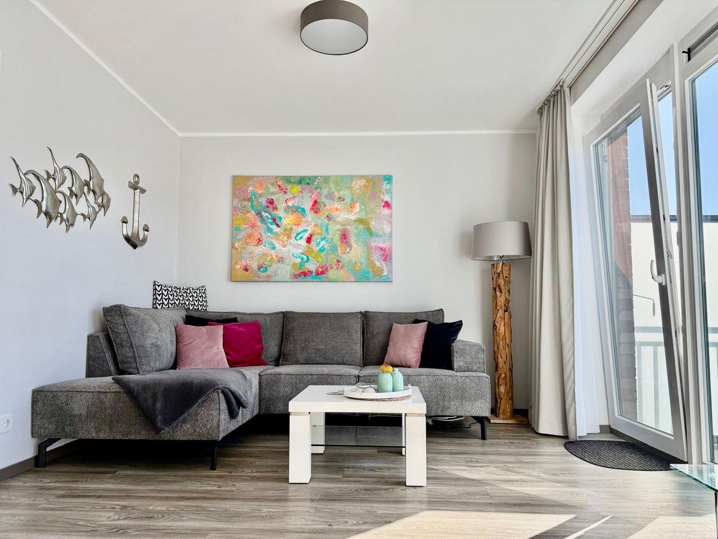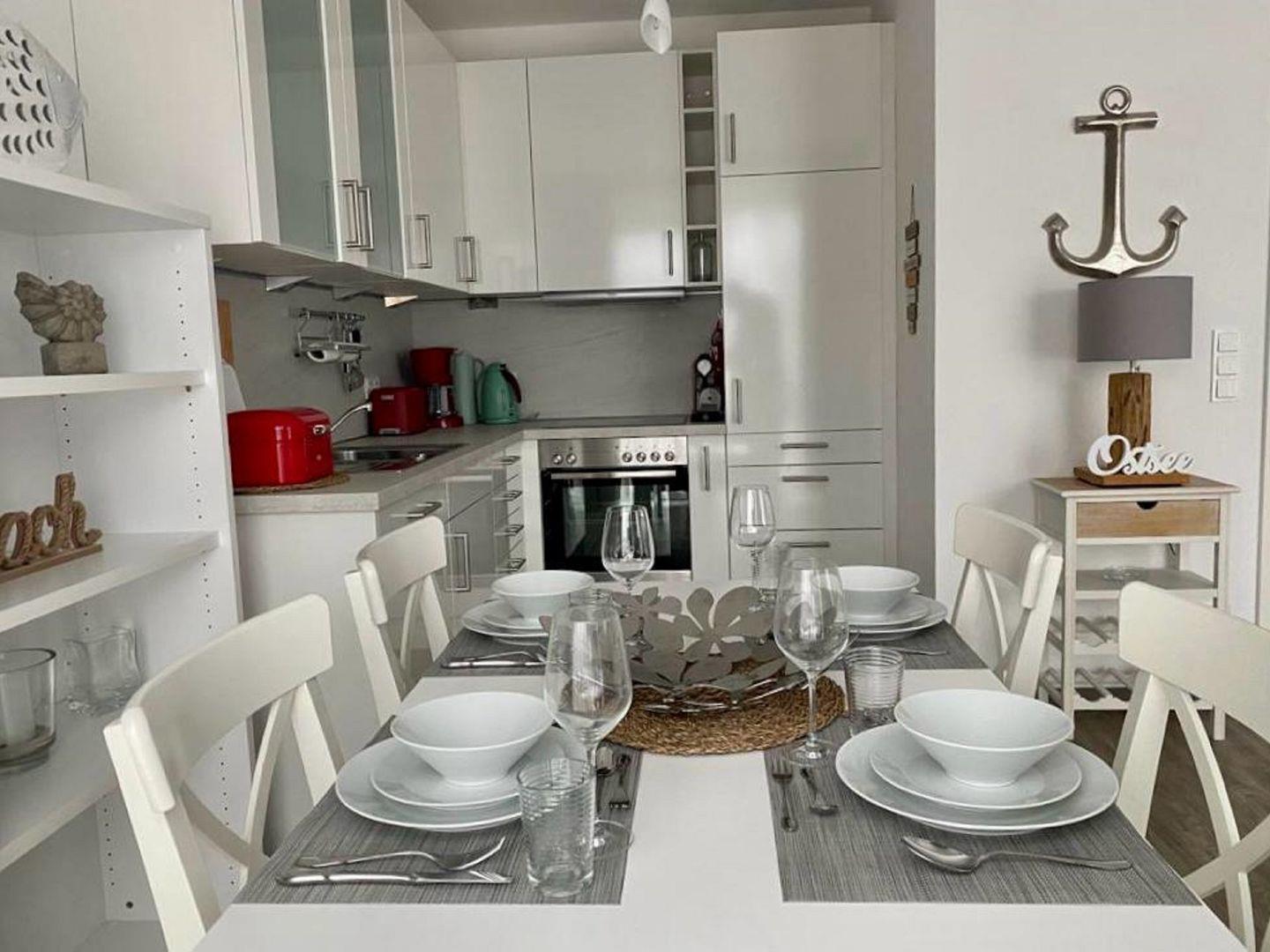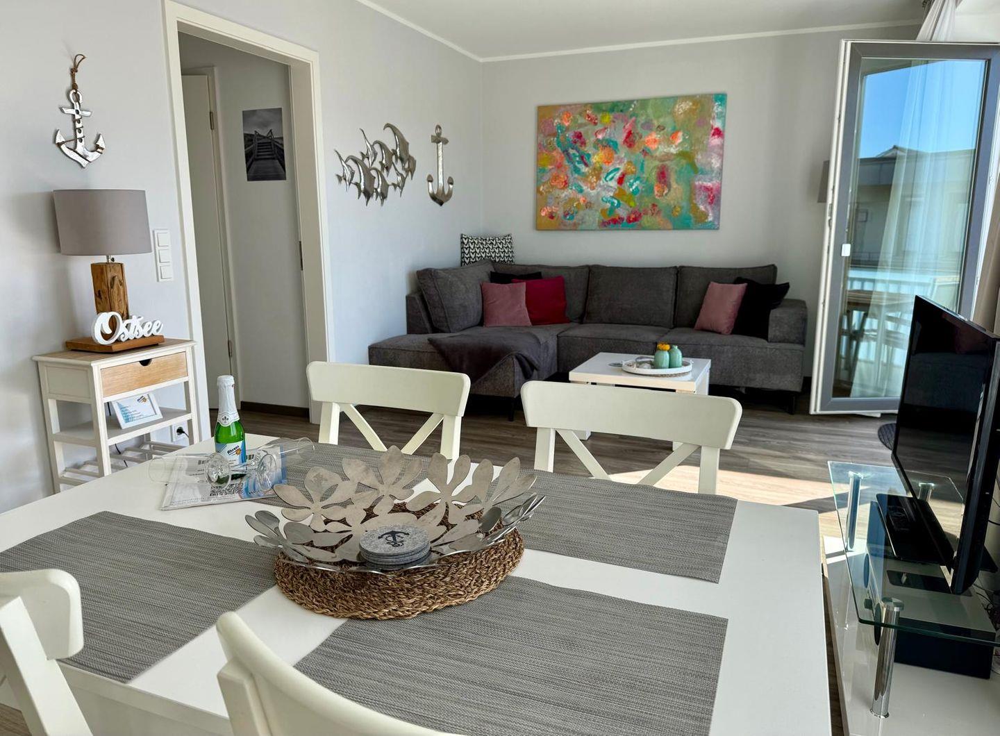 Der großzügige Wohnraum verfügt über eine gemütliche Couchecke mit Flach TV, einen schicken Essbereich sowie eine offen gestaltete Küche, die voll ausgestattet ist. Zaubern Sie sich in der Küche Ihr Urlaubsfrühstück und genießen Sie den Vormittag auf dem Balkon, der über den Wohnbereich zu erreichen ist. Eine Schatten spendende Markise stehet ihnen an den sonnigen Tagen zur Verfügung.