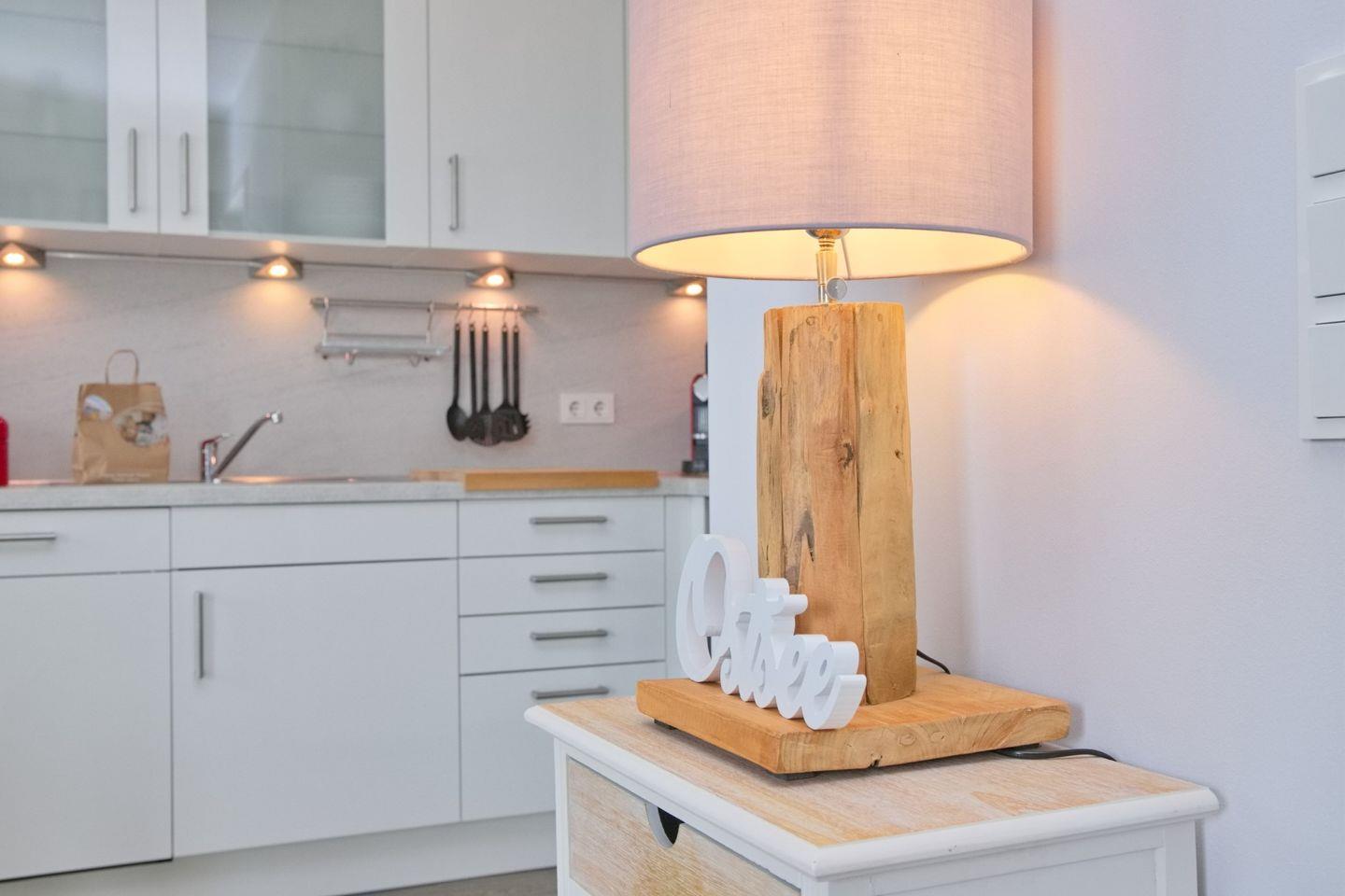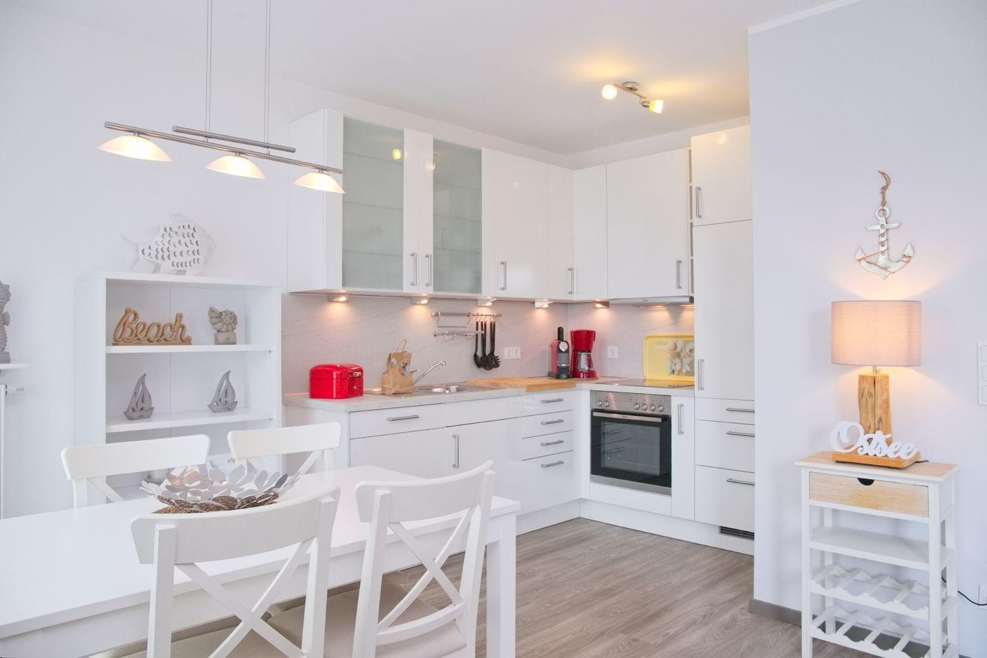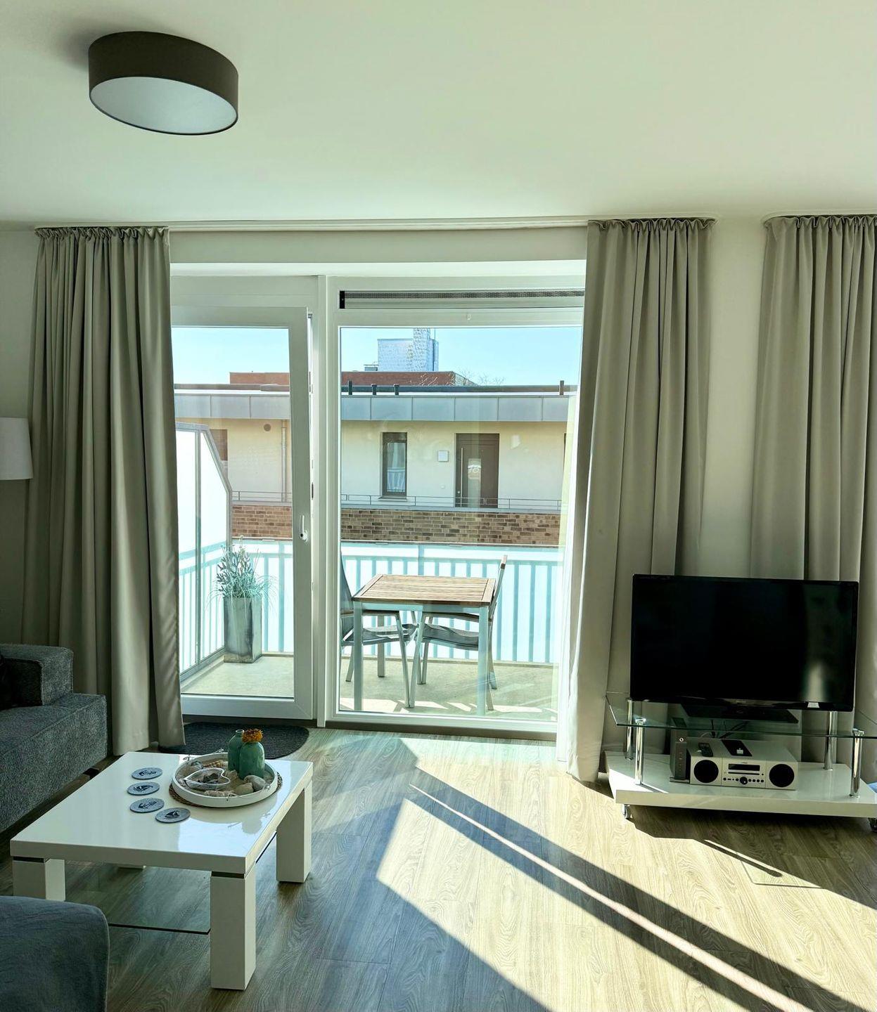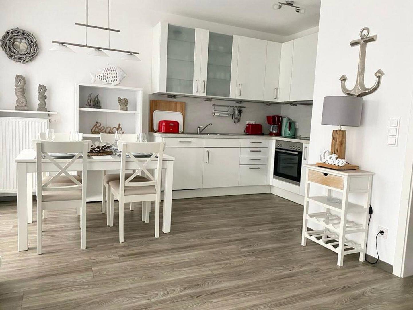 Der großzügige Wohnraum verfügt über eine gemütliche Couchecke mit Flach TV, einen schicken Essbereich sowie eine offen gestaltete Küche, die voll ausgestattet ist. Zaubern Sie sich in der Küche Ihr Urlaubsfrühstück und genießen Sie den Vormittag auf dem Balkon, der über den Wohnbereich zu erreichen ist. Eine Schatten spendende Markise stehet ihnen an den sonnigen Tagen zur Verfügung.