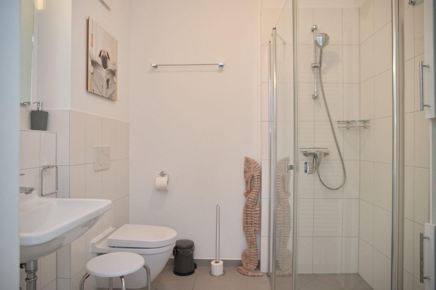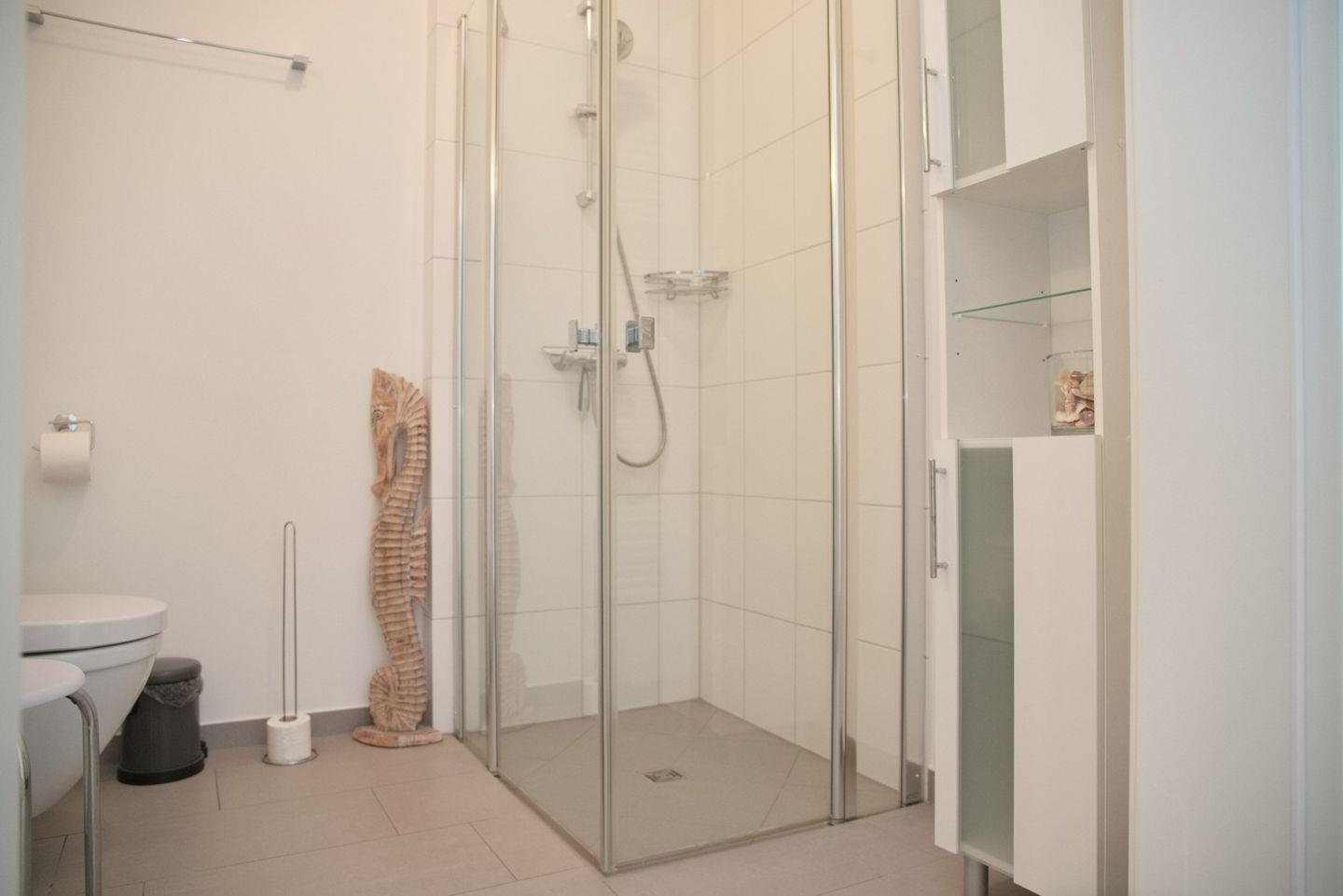 Das Badezimmer ist mit einer ebenerdigen Dusche, Waschtisch, WC, einem Badezimmerschrank und Fußbodenheizung ausgestattet.