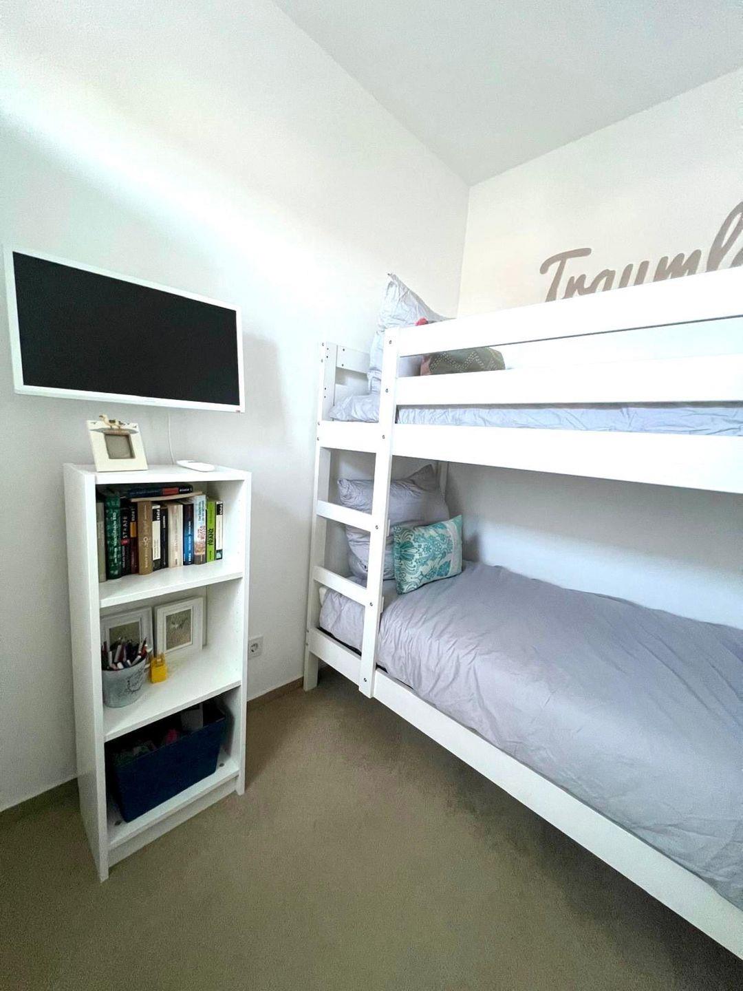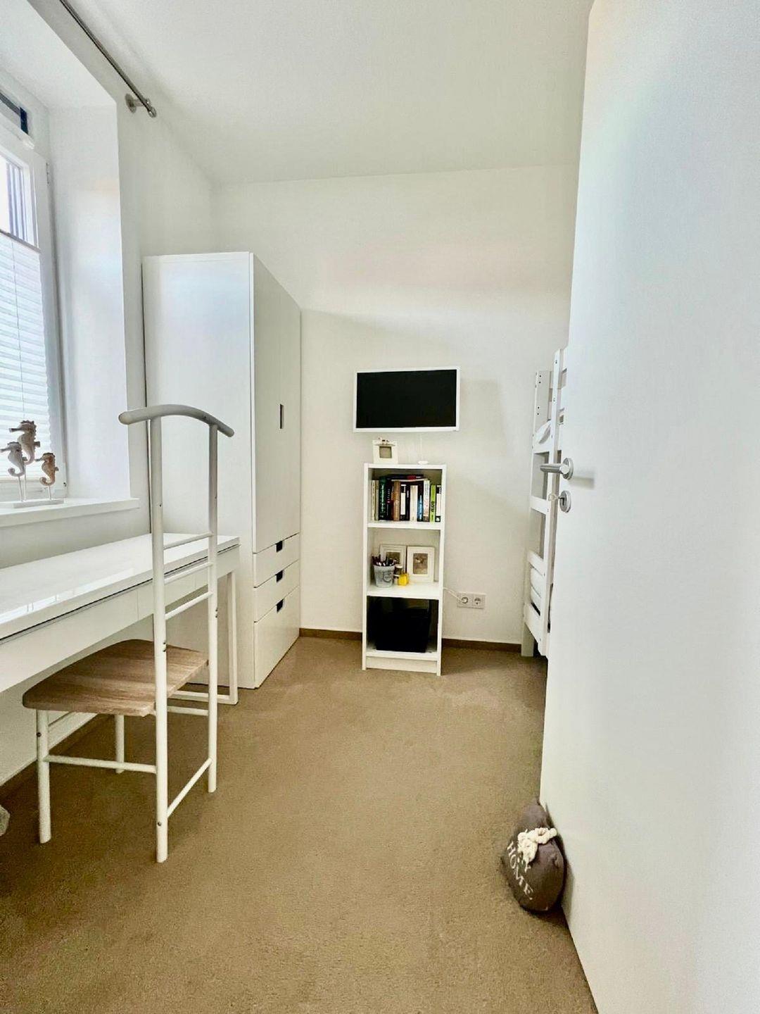 Das zweite Schlafzimmer ist etwas kleiner und bietet Ihnen ein Etagenbett, einen Kleiderschrank, einen Schreibtisch und einen Flach TV.