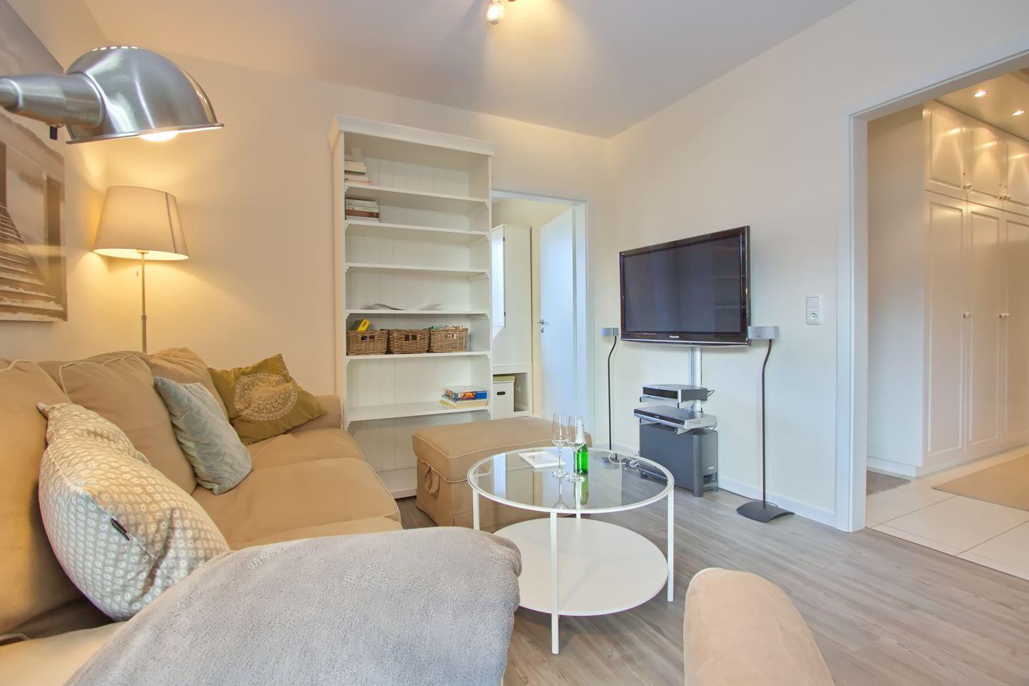 Das Wohnzimmer ist ausgestattet mit einem 3-Sitzer, einem Sessel, an der Wand hängender Flach-TV, DVD-Player und ein Bose Surround-Sound-System.