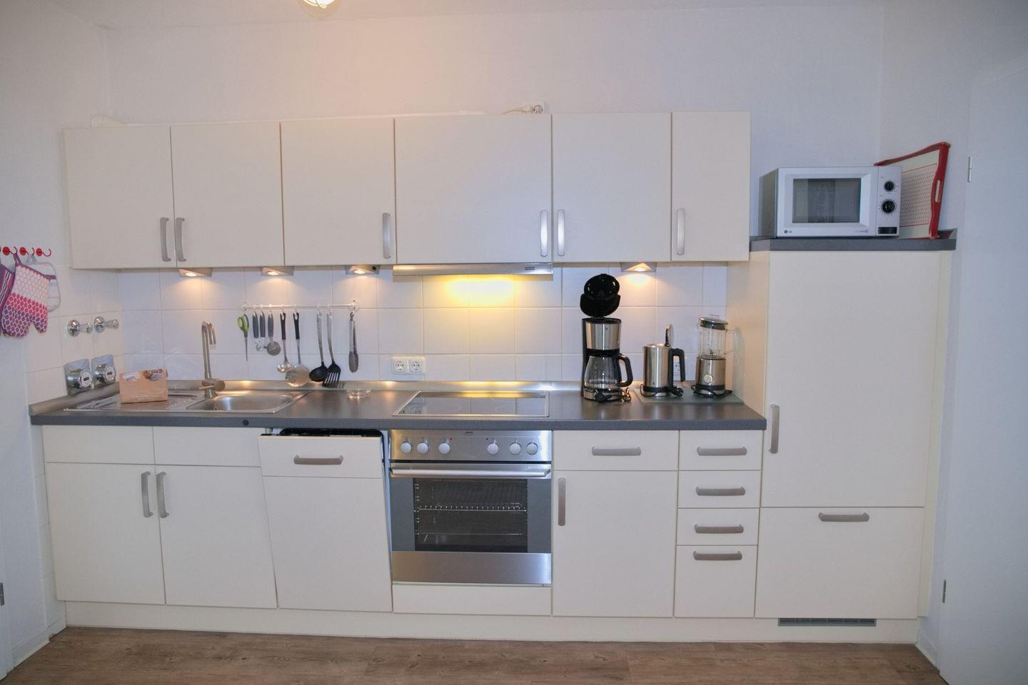 In der voll ausgestatteten Küche finden Sie alles, was Sie für die Zubereitung köstlicher Mahlzeiten benötigen, darunter ein Ceranfeld, Backofen, Kühlschrank mit Gefrierfach, Kaffeemaschine, Mikrowelle, Spülmaschine, Toaster, Wasserkocher und Standmixer.