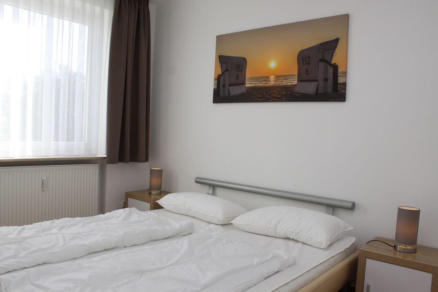 Das Schlafzimmer grenzt an den Wohnbereich und verfügt über ein Doppelbett (2x90x200 cm) und einen Kleiderschrank. Genießen Sie auch hier schon beim Aufstehen den Blick auf die See.