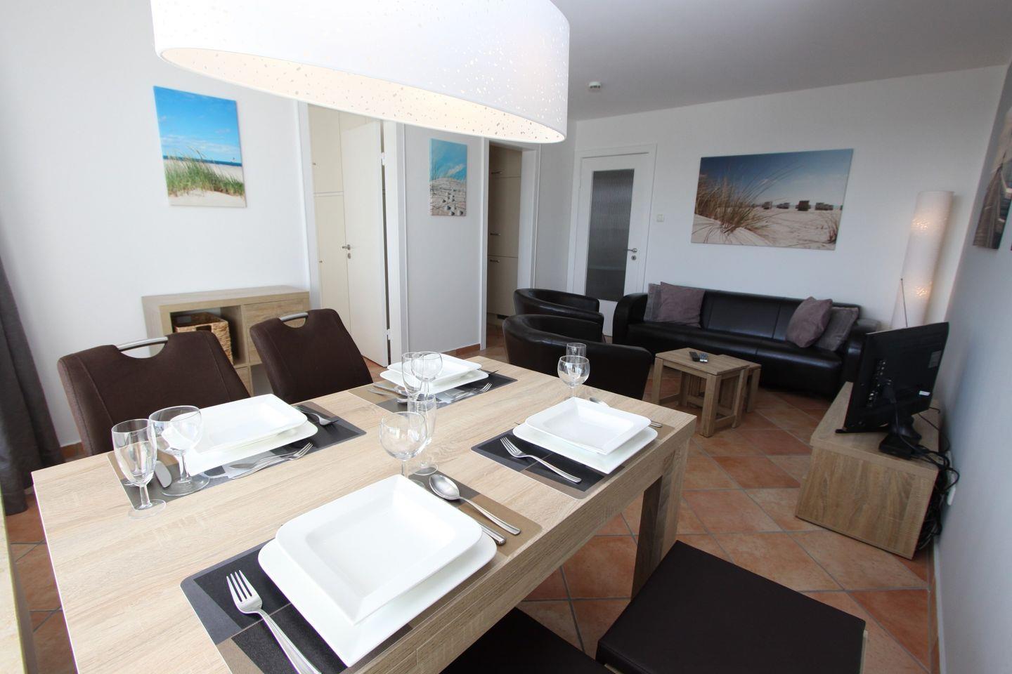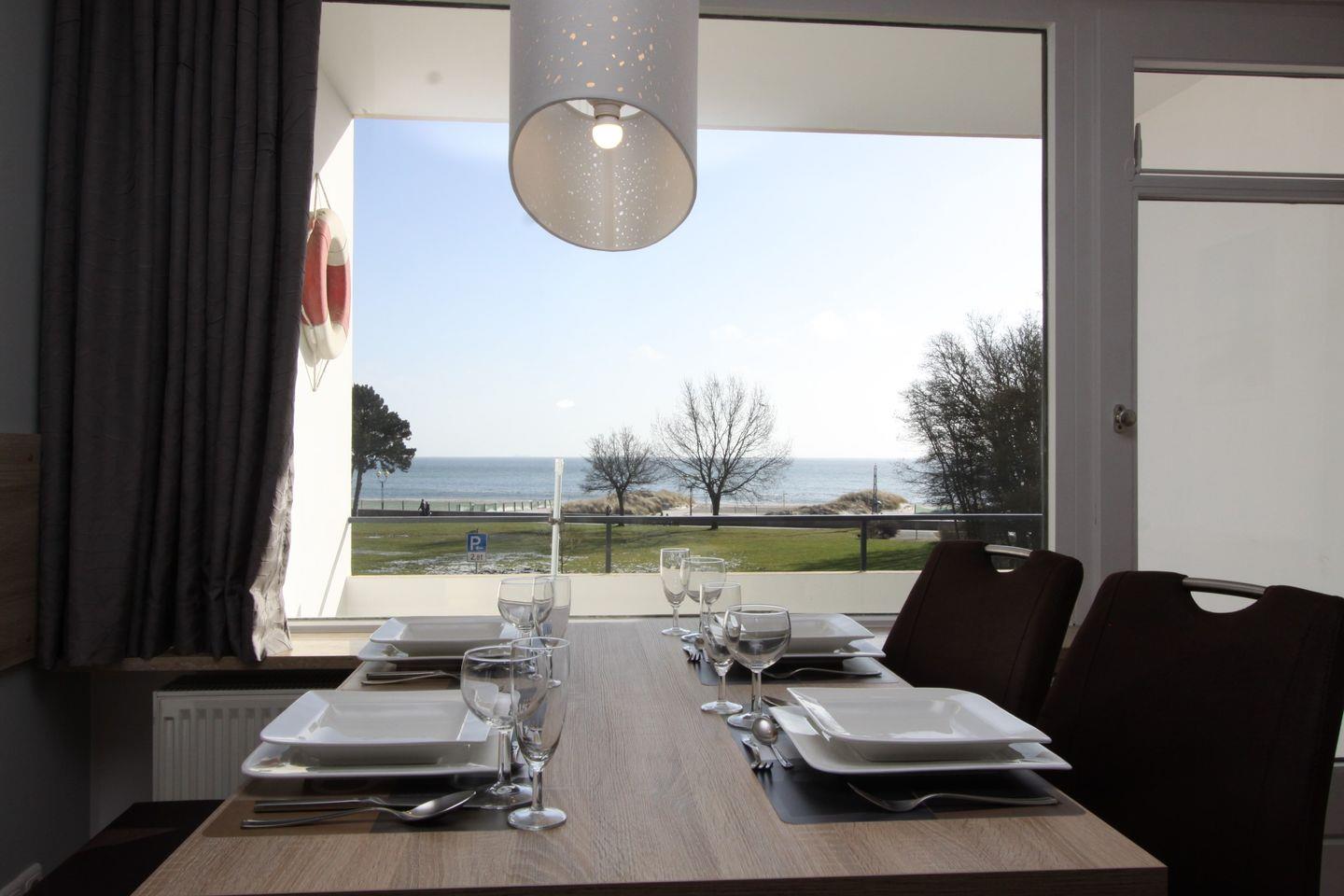 Ein Flachbild- TV und ein Radio stehen Ihnen zur Unterhaltung bereit. Der offene Essbereich im Wohnzimmer lädt beim morgendlichen Frühstück mit Blick auf die Ostsee zum verweilen ein.