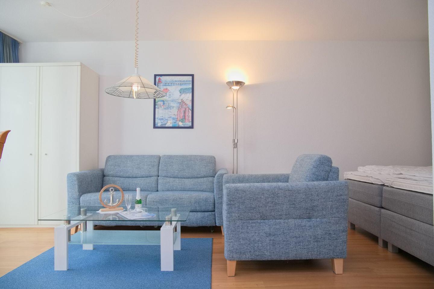 kann, zwei Sessel, einenFlach-TV, eine Stereoanlage, ein Doppelboxspringbett