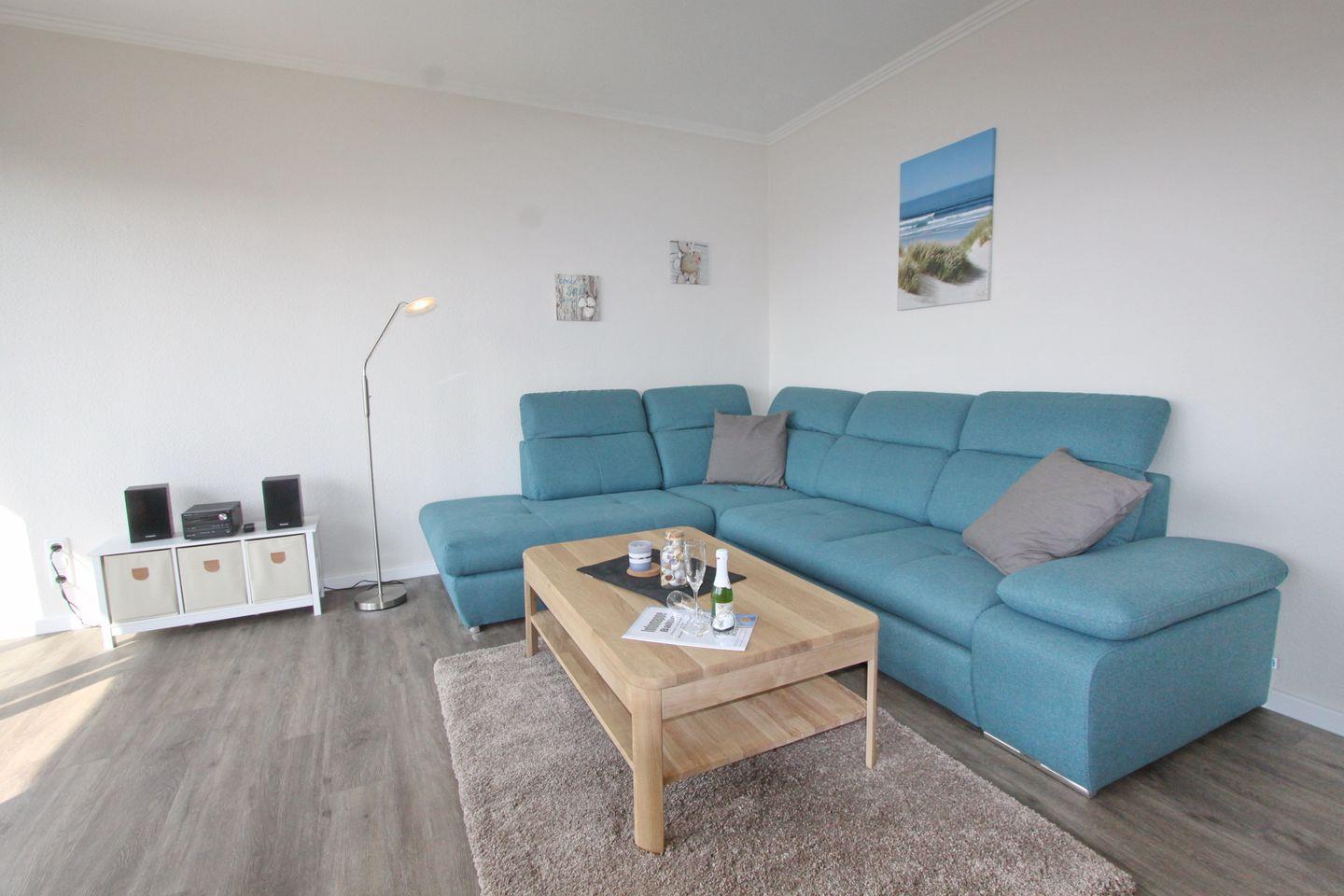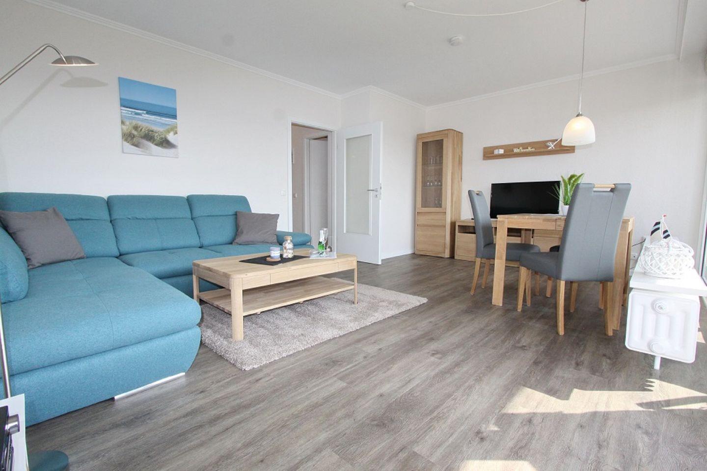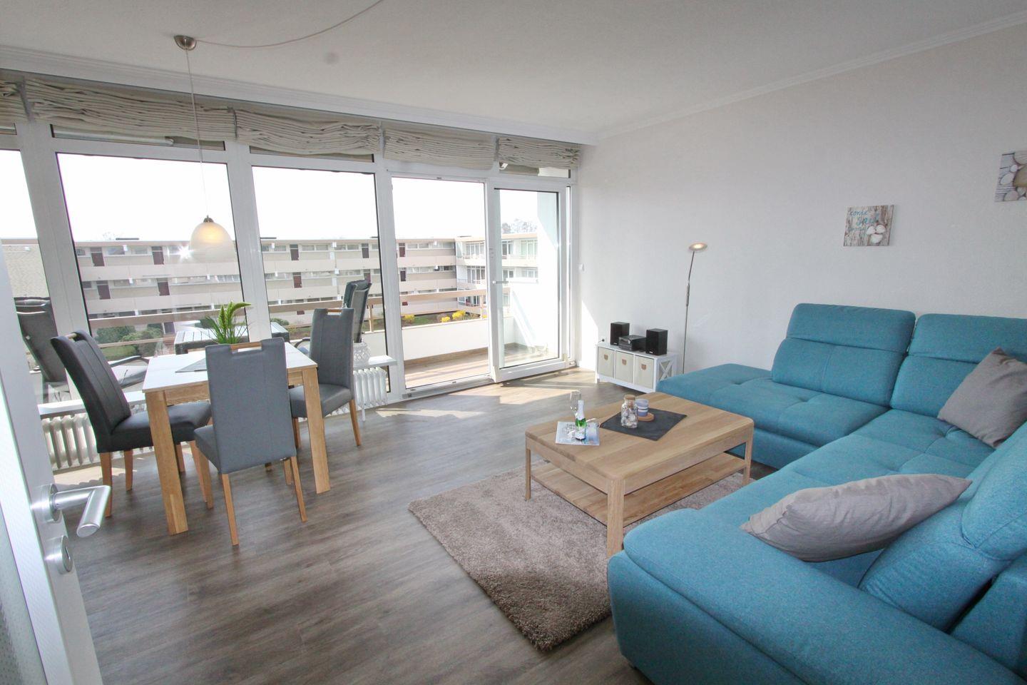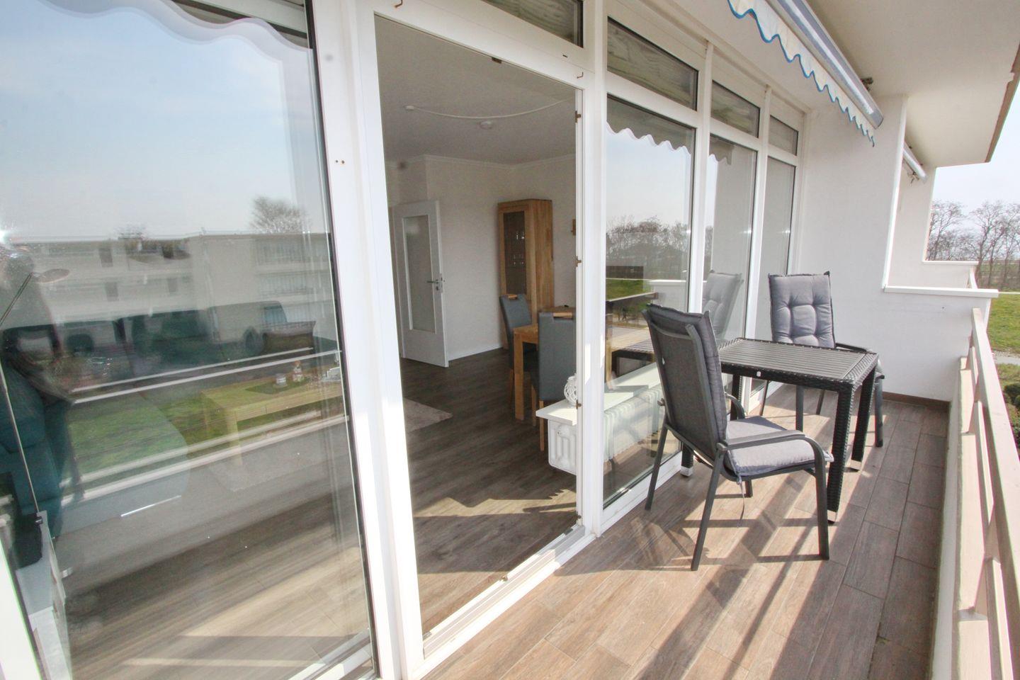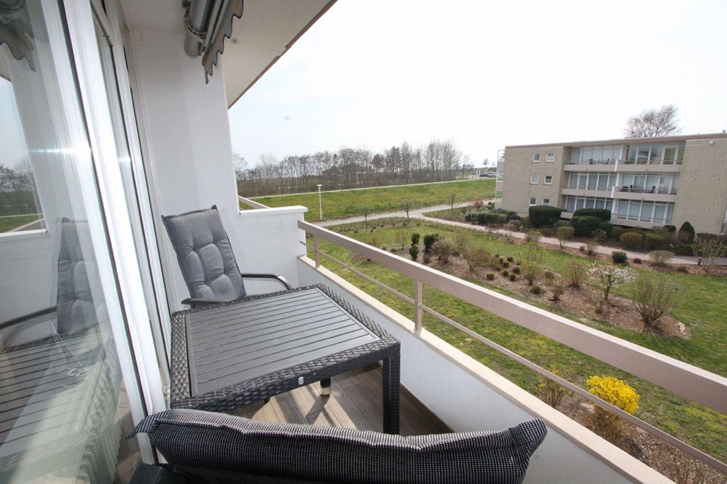 Gemütliche Ferienwohnung mit möblierten Süd/West Balkon mit Markise und Teilseeblick, direkt hinter dem Deich, nur ein Steinwurf vom feinen Sandstrand.