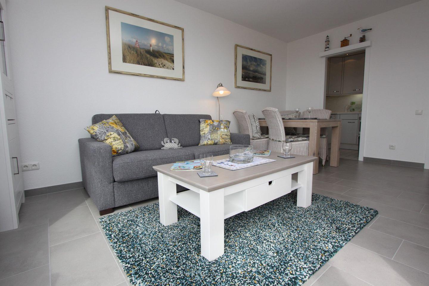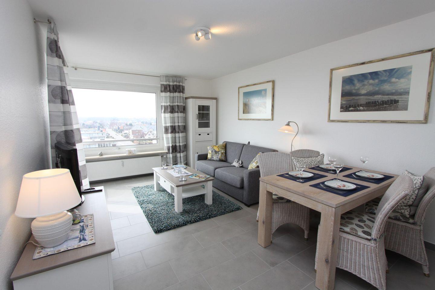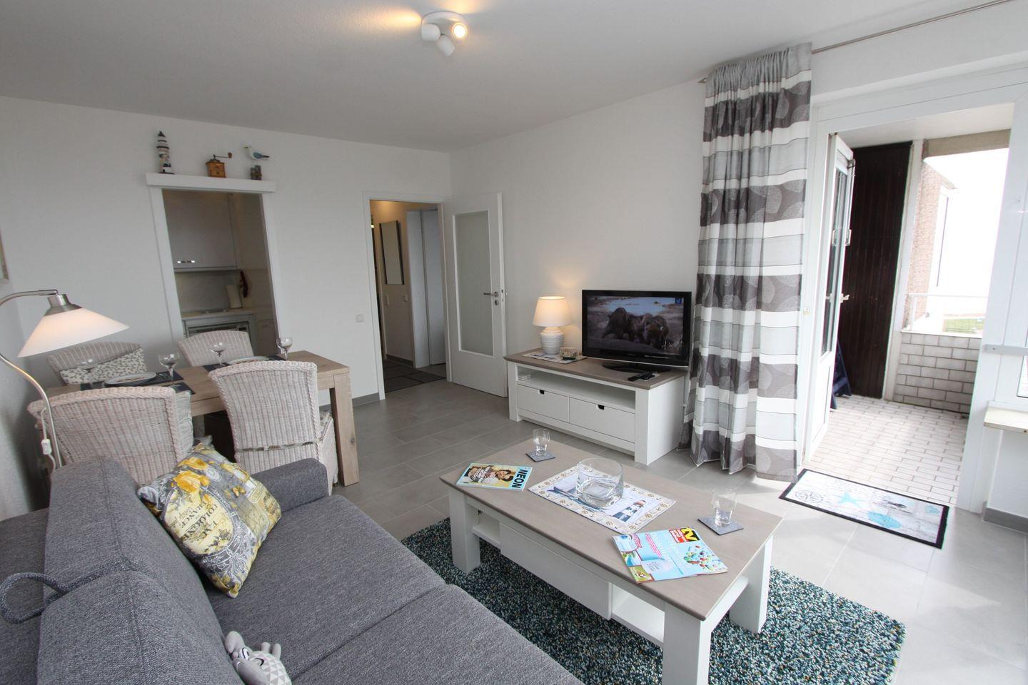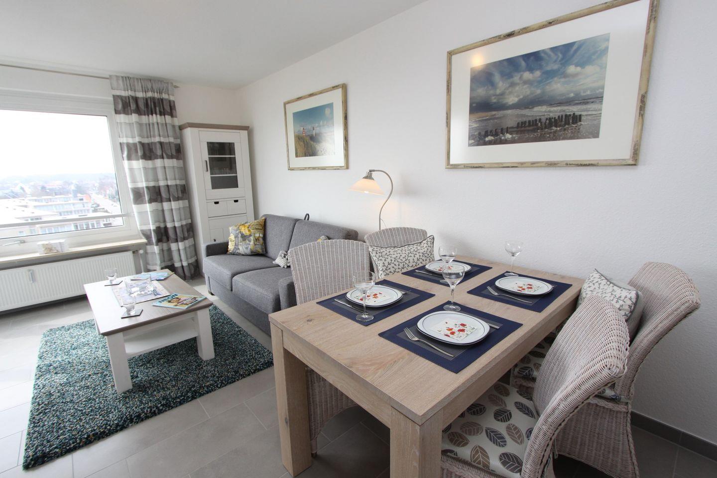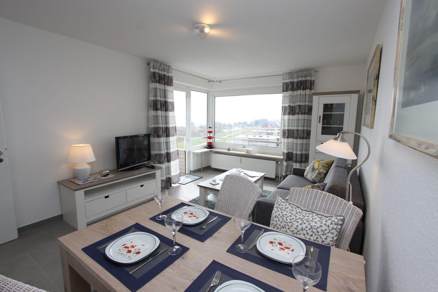 Moderne und hochwertige Ferienwohnung mit möblierten Süd- Westbalkon direkt hinter dem Deich, nur ein Steinwurf zum feinen Sandstrand und der Promenade.