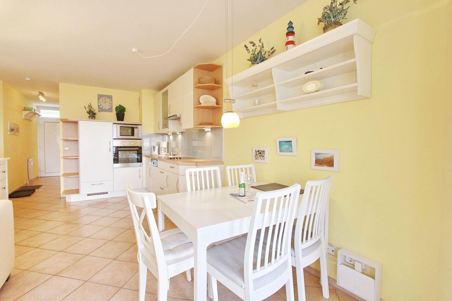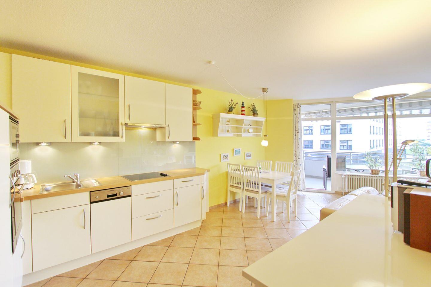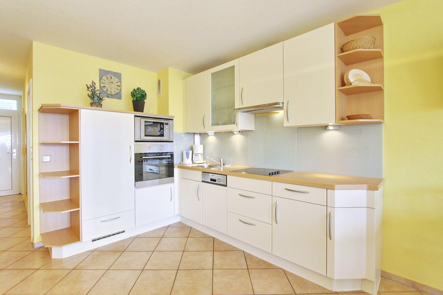 Die offene Einbauküche ist komplett ausgestattet mit Cerankochfeld, Backofen, Geschirrspüler, Mikrowelle, Kühlschrank mit großem Gefrierfach, Wasserkocher, Toaster und Kaffeemaschine.