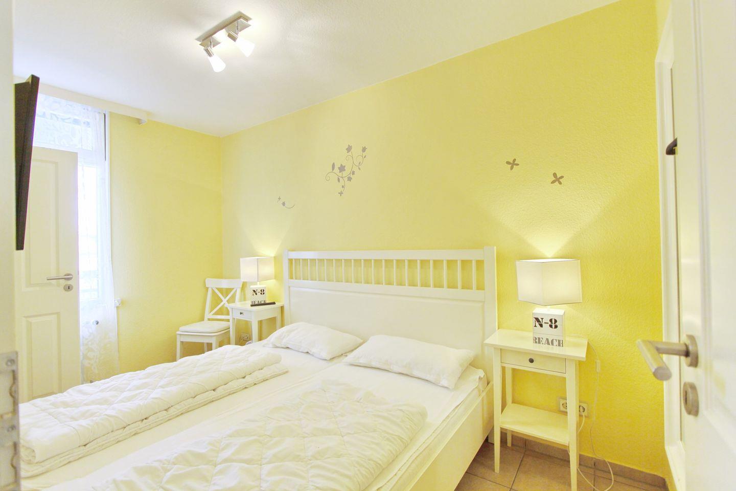 Zu Ihrer Linken erwartet Sie das erste Schlafzimmer, welches durch zwei Türen zu begehen ist, mit Doppelbett und Nachttischen. Außenrollläden zum Verdunkeln bringen erholsamen Schlaf.