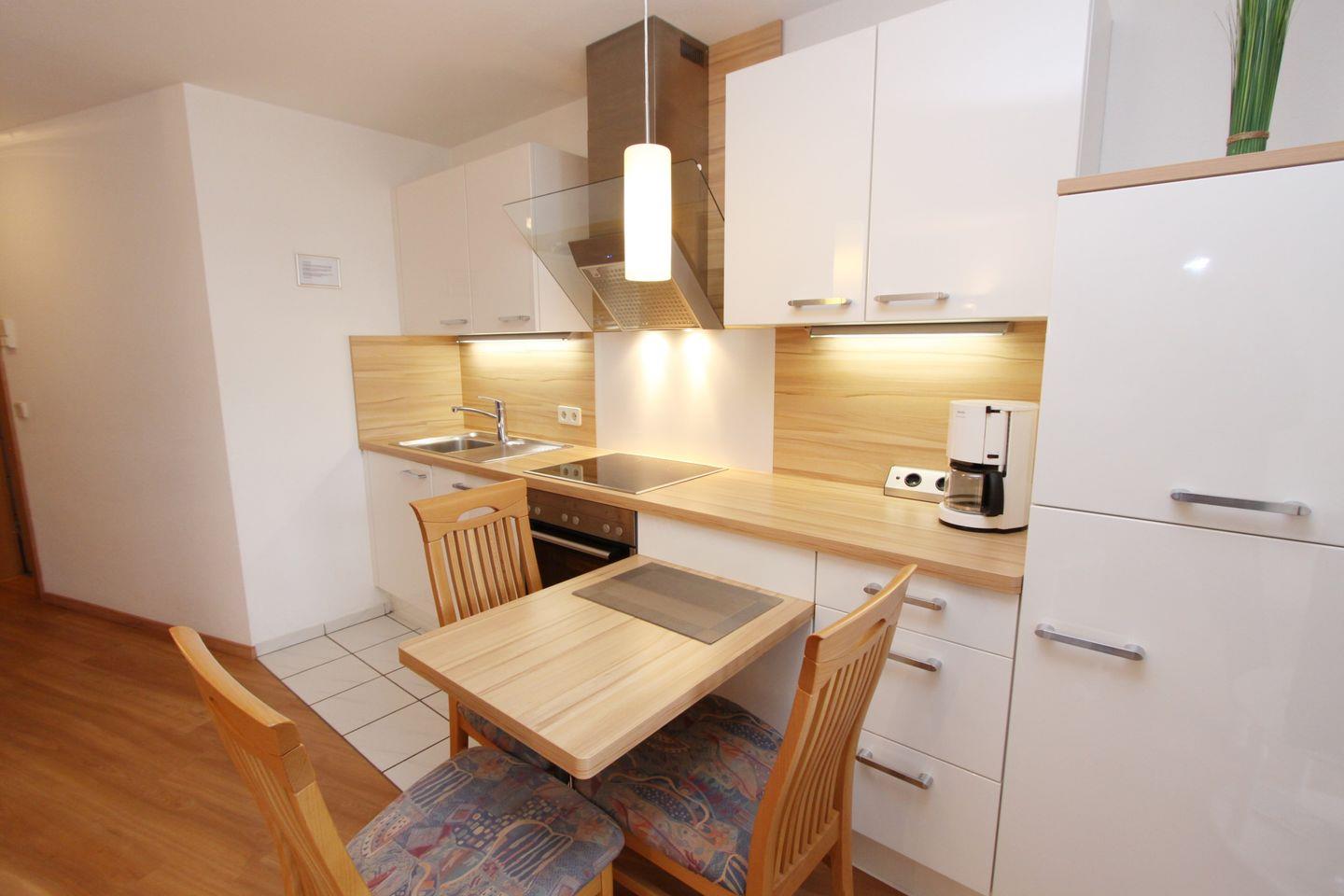 Esstisch mit 3 Stühlen. Die moderne, zum Wohnzimmer offene, Einbauküche ist mit