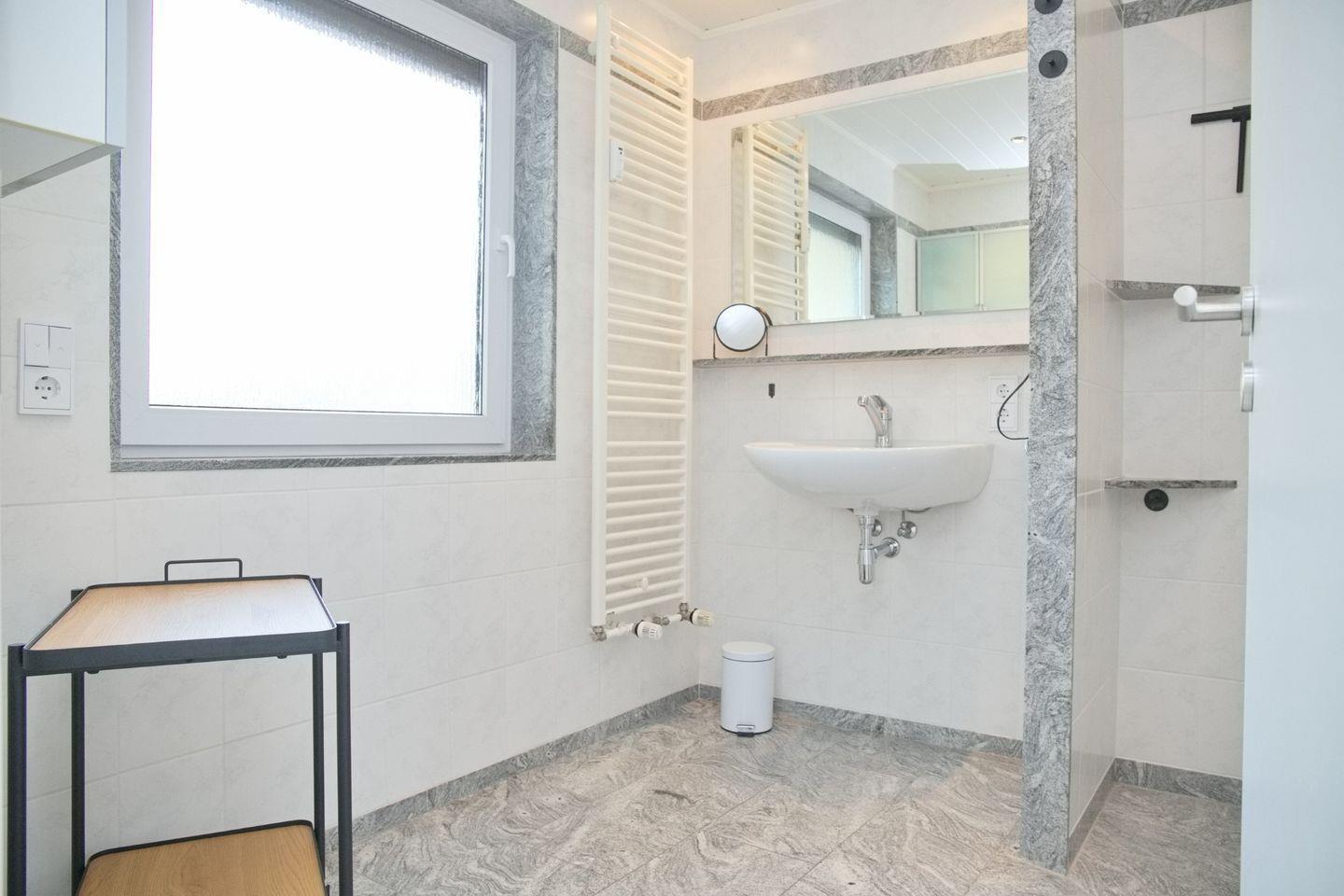 Das moderne Badezimmer überzeugt mit einer ebenerdigen Dusche, einem WC, einem Waschbecken sowie einem großen Spiegel. Praktischer Stauraum wird durch einen Hängeschrank und ein Ablageregal geboten. Der Handtuchheizkörper sorgt stets für angenehm warme Handtücher und die Fußbodenheizung für ein wohliges Gefühl, wenn Sie aus der Dusche kommen.