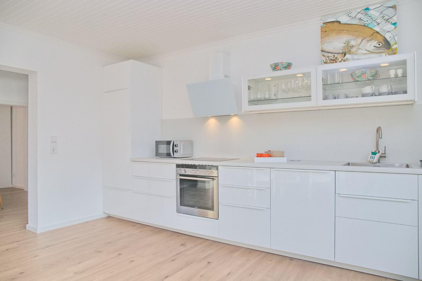 Die moderne, offene Küche ist perfekt für alle, die gerne kochen. Sie ist mit einem Cerankochfeld, einem Backofen, einem Geschirrspüler, einer Mikrowelle und einem Kühlschrank mit Gefrierfach ausgestattet. Zusätzlich stehen ein Wasserkocher, ein Toaster und eine Kaffeemaschine zur Verfügung, um Ihre morgendliche Routine zu erleichtern.