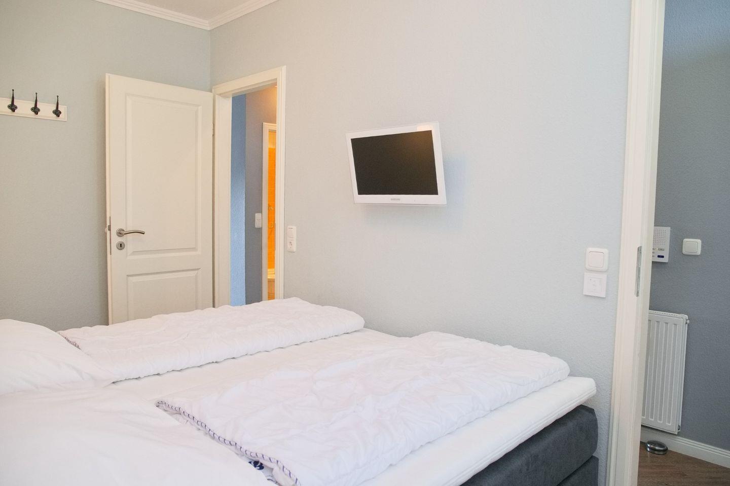 Das Hauptschlafzimmer verfügt über ein komfortables Boxspringbett (2x90x200 cm) mit einzelnen Toppers für zusätzlichen Komfort sowie einen kleinen Flatscreen-TV. Das Kinderzimmer bietet ein Bett, das bei Bedarf zu einem Doppelbett ausgezogen werden kann, sowie einen Kleiderschrank.