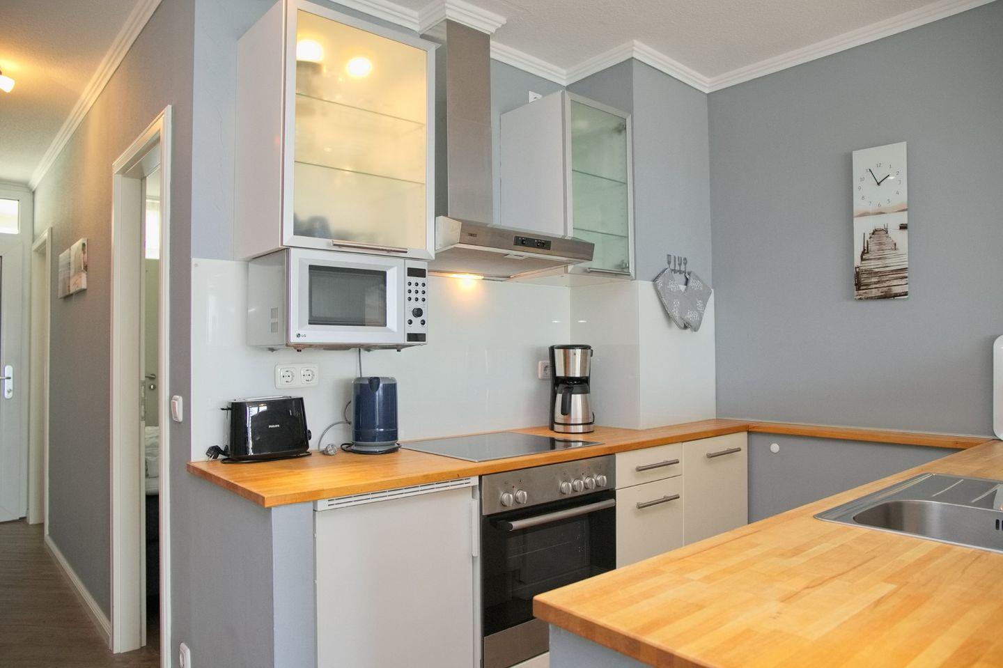 Die moderne Küche ist voll ausgestattet und bietet alles, was Sie benötigen, um köstliche Mahlzeiten zuzubereiten, darunter ein Ceranfeld, Backofen, Geschirrspüler, Mikrowelle, Kühlschrank mit Gefrierfach, Toaster, Kaffeemaschine und Wasserkocher.