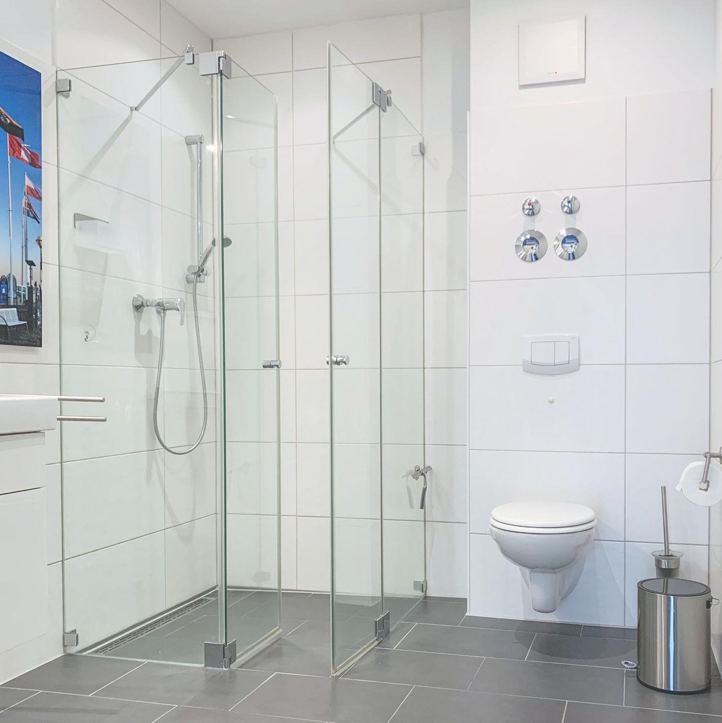 Zurück auf den Flur kommen Sie in das geräumige Badezimmer. Dieses verfügt über eine bodengleiche Dusche, ein wandhängendes WC, einen Waschtisch mit Spiegelschrank und einem Hochschrank als Verstaumöglichkeit.