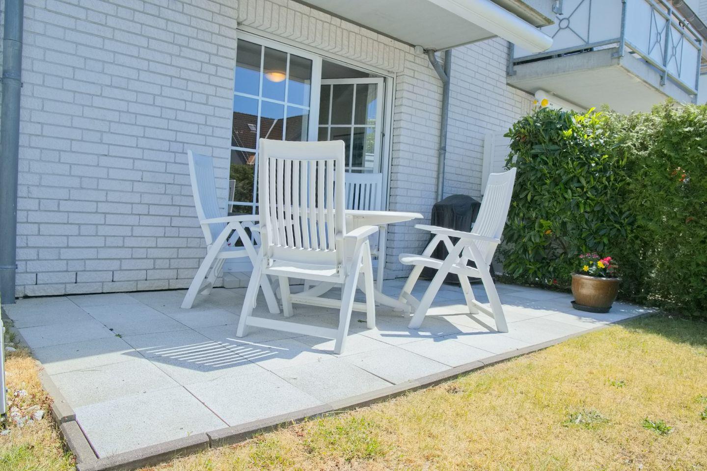 Die Besonderheit dieser Ferienwohnung ist die großzügige Terrasse, die mit Gartenmöbeln ausgestattet ist – der ideale Ort, um den Tag bei einer Tasse Kaffee oder einem Glas Wein ausklingen zu lassen. Hier können Sie die frische Ostseeluft genießen und die warmen Sonnenstrahlen auf Ihrer Haut spüren. Ein angrenzender Garten lädt zudem zu entspannenden Momenten im Freien ein.