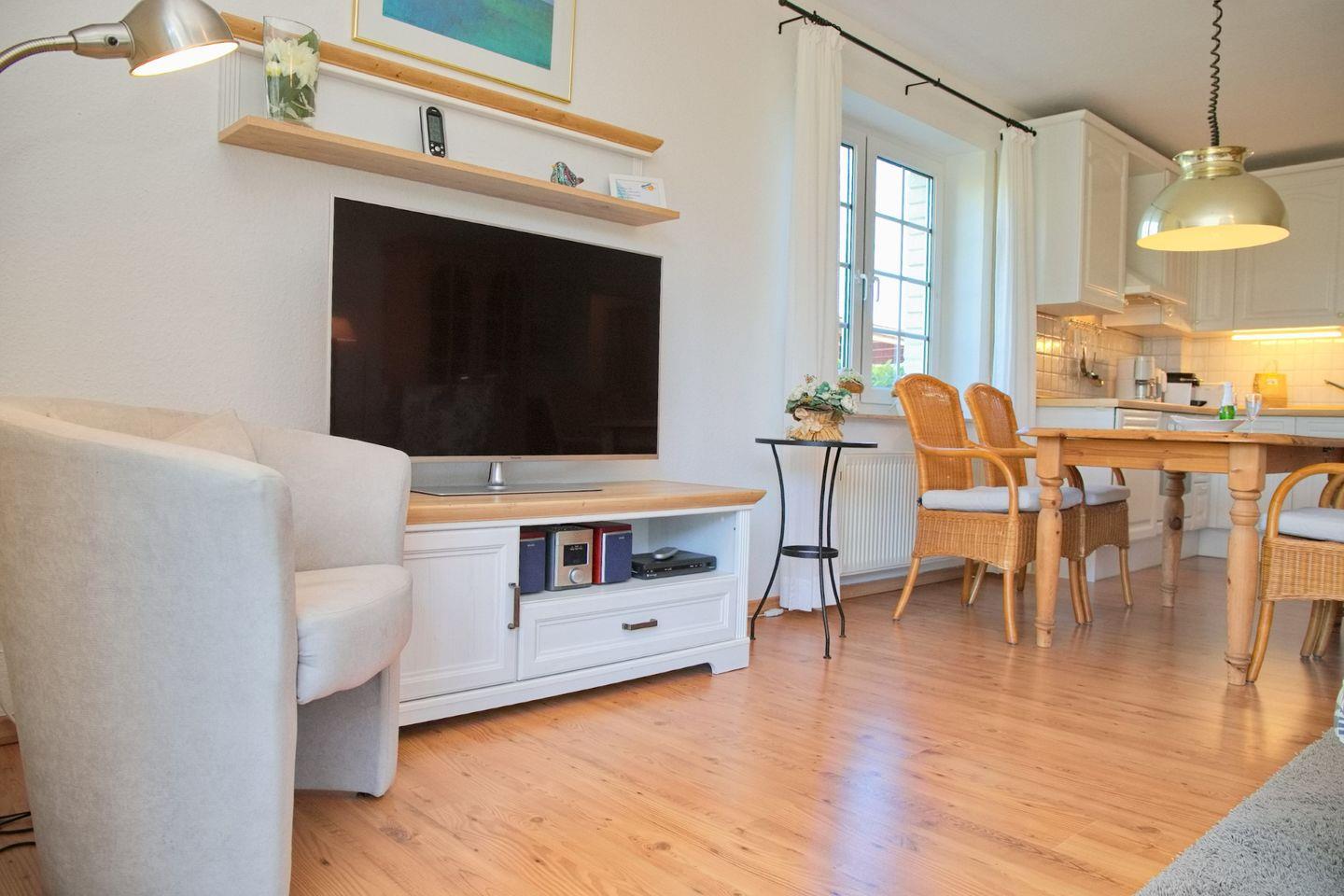 Die Ferienwohnung besticht durch ihre moderne, offene Küche, die mit allen nötigen Annehmlichkeiten ausgestattet ist, darunter ein Ceran-Herd, Backofen, Mikrowelle, Geschirrspüler und Kühlschrank. Zusätzlich finden Sie in der Küche eine Kaffeemaschine, einen Wasserkocher und einen Toaster – ideal für ein entspanntes Frühstück oder ein gemeinsames Abendessen. Der Essbereich in Verbindung mit dem hellen Wohnzimmer schafft eine einladende Atmosphäre, in der Sie schöne Momente mit Ihren Liebsten verbringen können. Genießen Sie einen Filmabend auf dem großen Fernseher oder entspannen Sie auf dem Sofa und lassen die Seele baumeln.