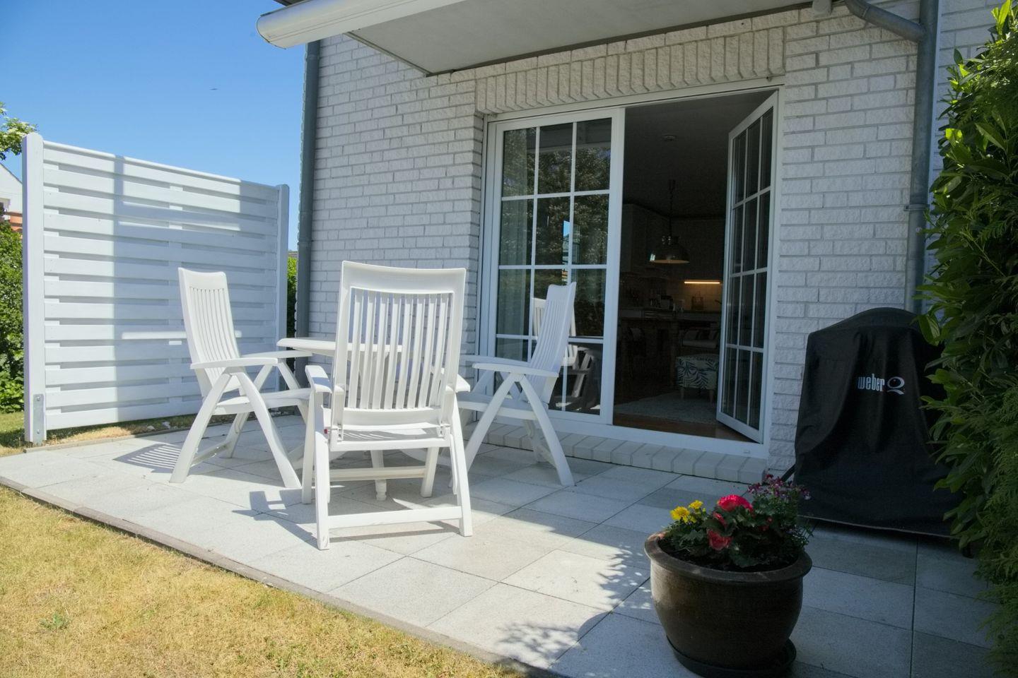Sehr schöne Ferienwohnung im Erdgeschoss mit möblierter Südwest-Terrasse und kleinem Garten. Nur ein Steinwurf vom Meer und dem Strand entfernt.