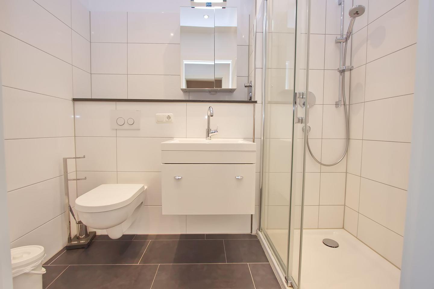 Das stilvolle Badezimmer ist mit einer ebenerdigen Dusche, Waschbecken, WC, Spiegelschrank sowie einem Handtuchheizkörper ausgestattet.