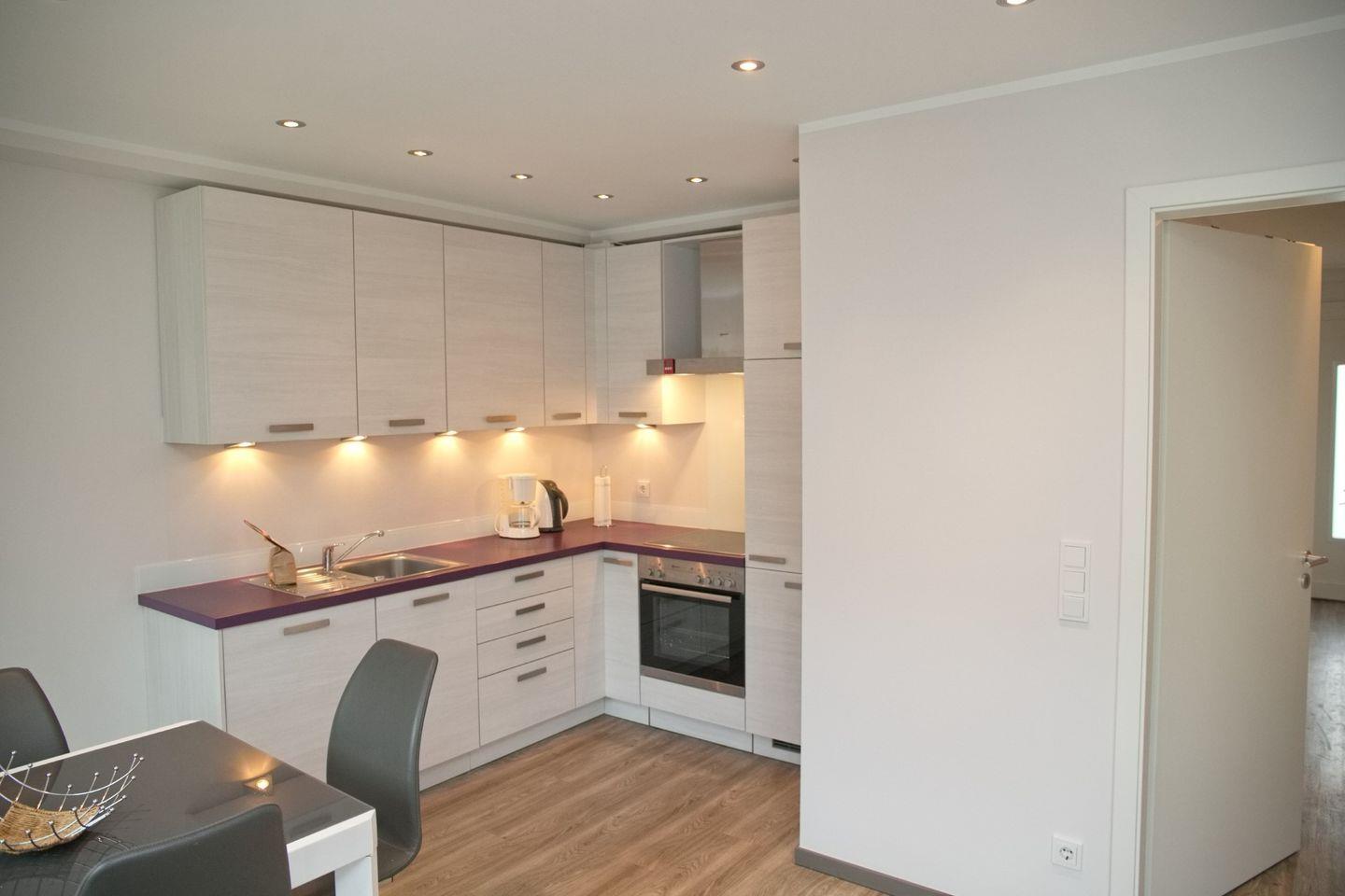 In dem mit Erdtönen eingerichteten Wohnbereich finden sich eine Eckcouch, ein moderner Flach-TV, ein gemütlicher Essbereich für 4 Personen, mit Zugang zum Balkon sowie die offene Küche. Die stilvolle, offene Küche ist mit einem Backofen, einem Kühlschrank mit Gefrierfach, einem Cerankochfeld, einer Dunstabzugshaube, einem Geschirrspüler und einer Kombi-Kaffeemaschine/Wasserkocher/Toaster ausgestattet.