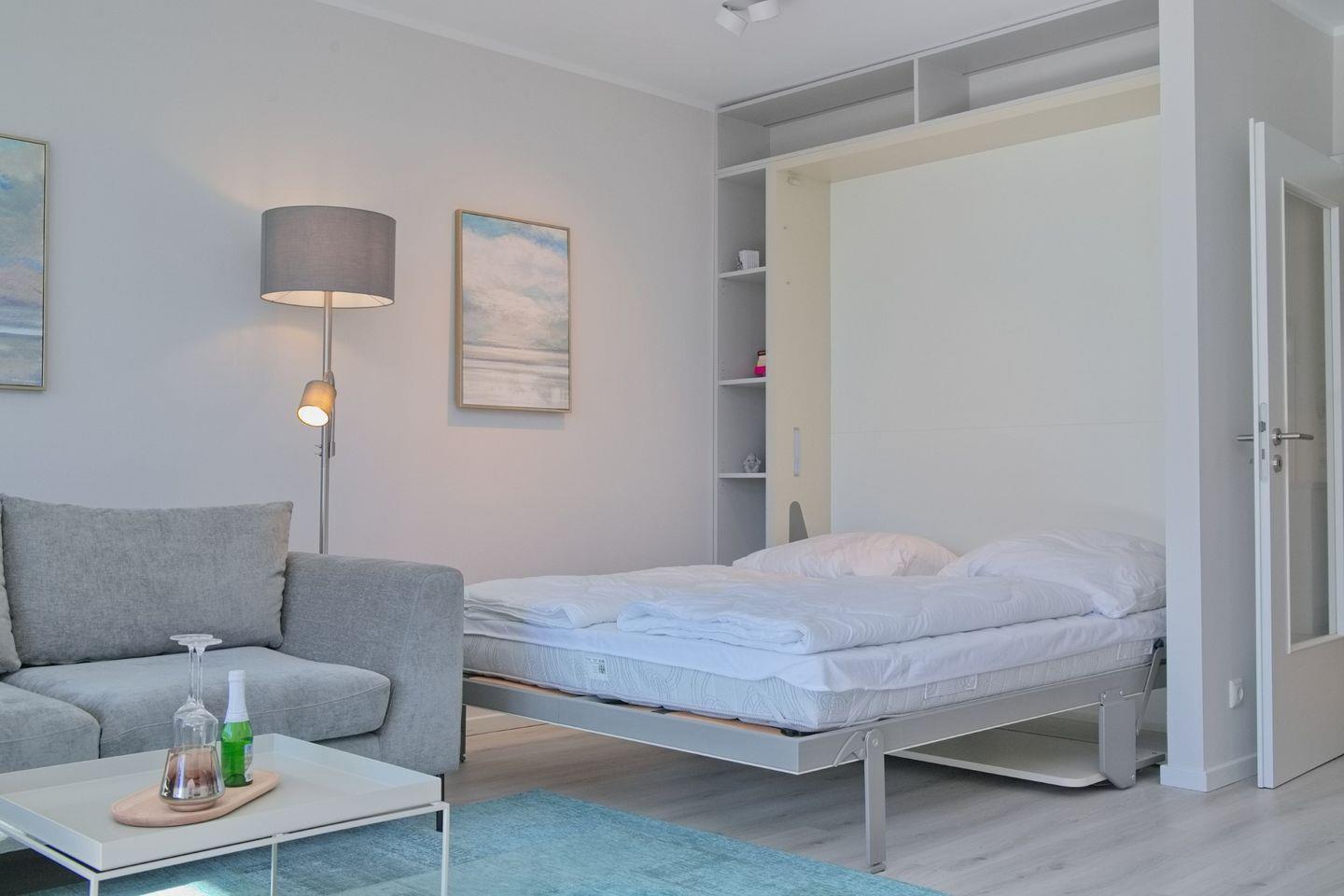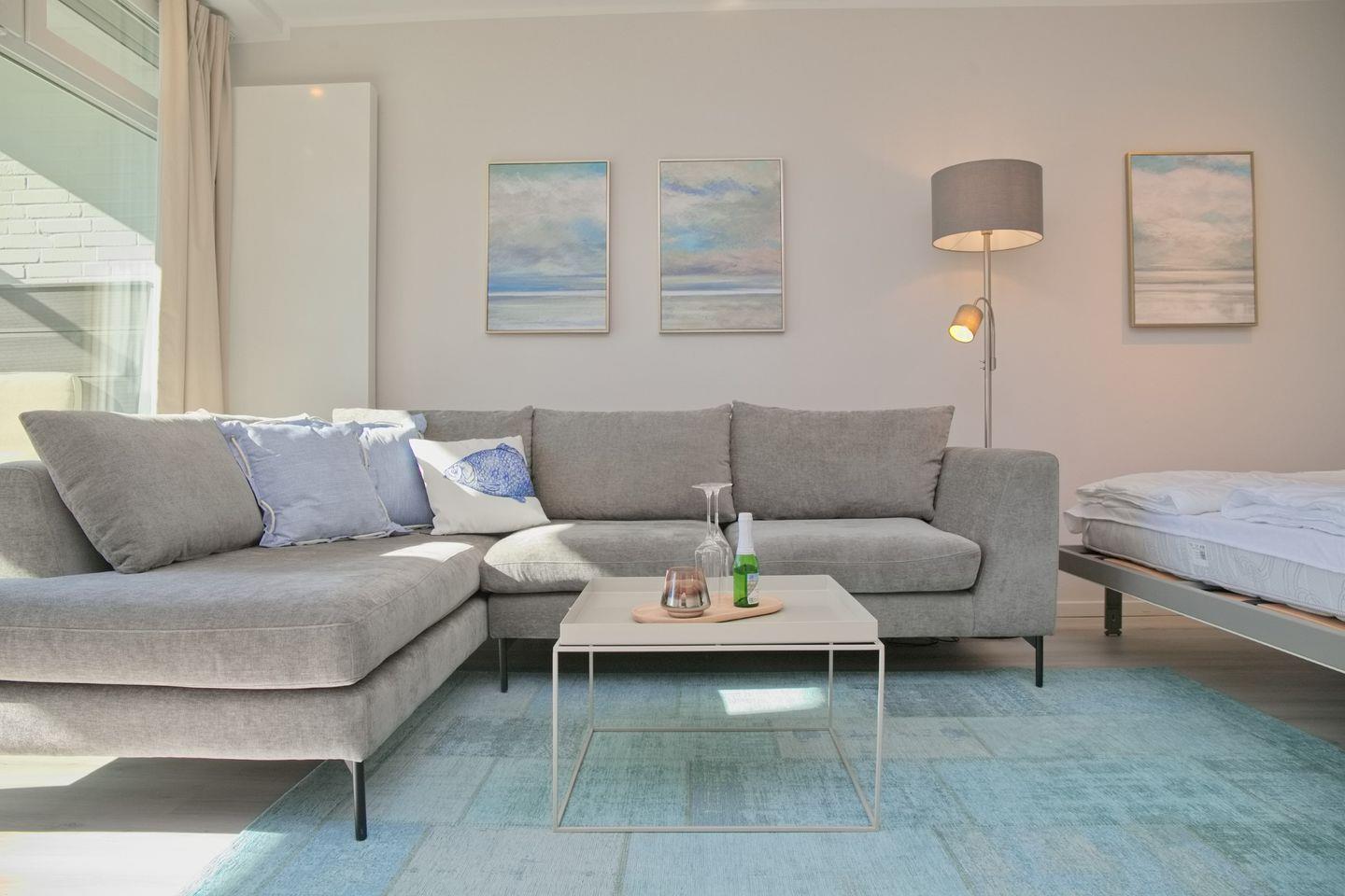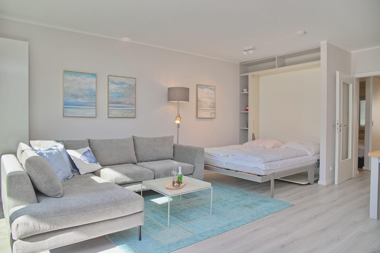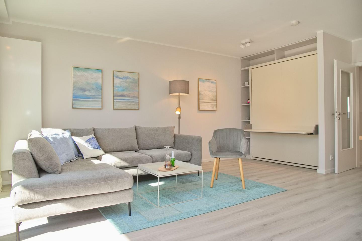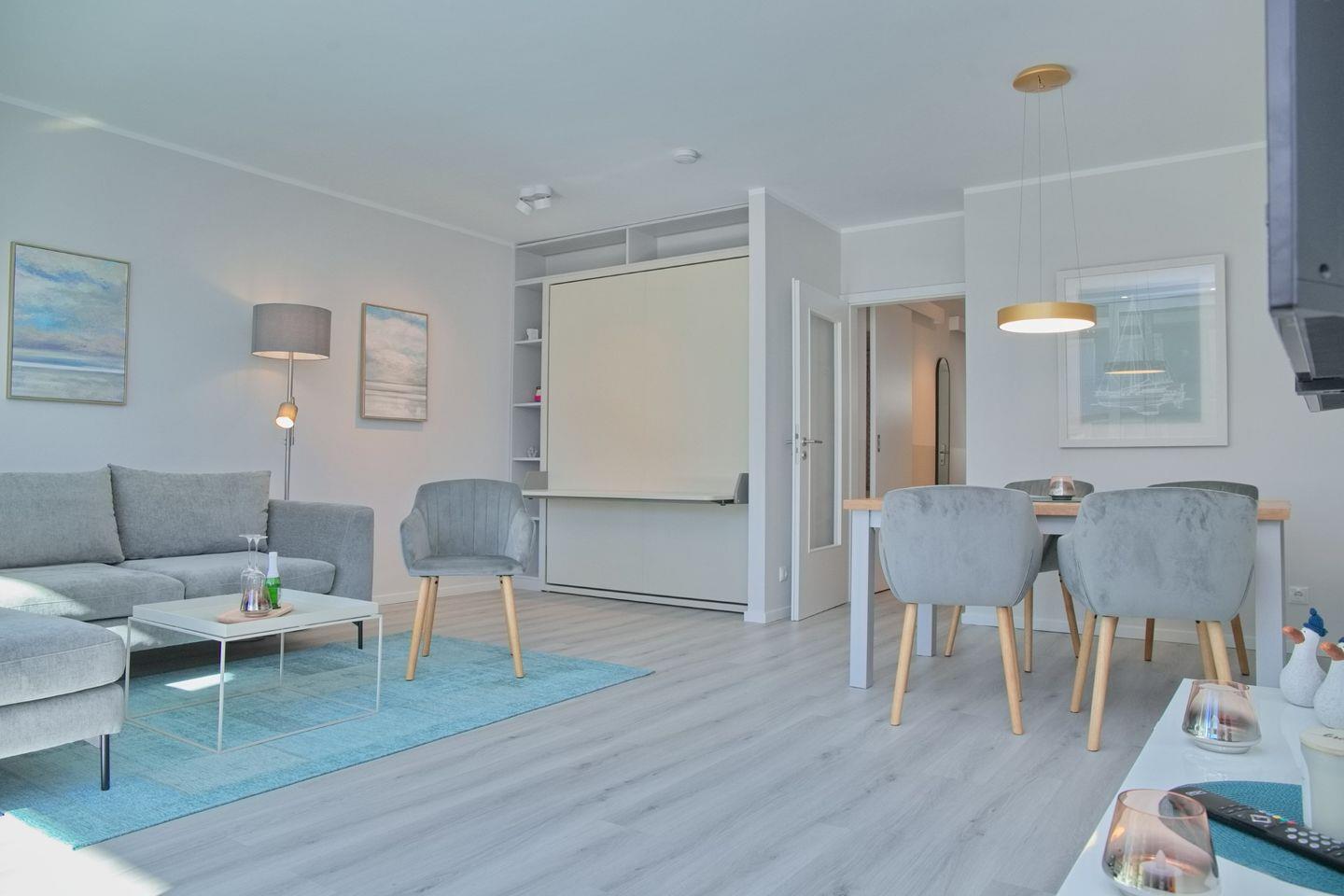 Das lichtdurchflutete Wohnzimmer ist stilvoll eingerichtet und verfügt über eine moderne Couchgarnitur mit Ottomane sowie einen Essbereich. Ein neuer Flachbildfernseher sorgt für Unterhaltung, und das platzsparende Schrankbett mit einer Liegefläche von 180x200 cm bietet eine komfortable Schlafmöglichkeit, die tagsüber unsichtbar verstaut werden kann.