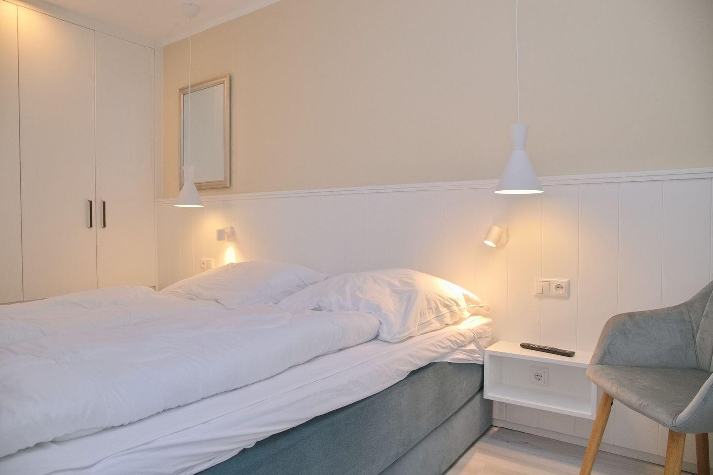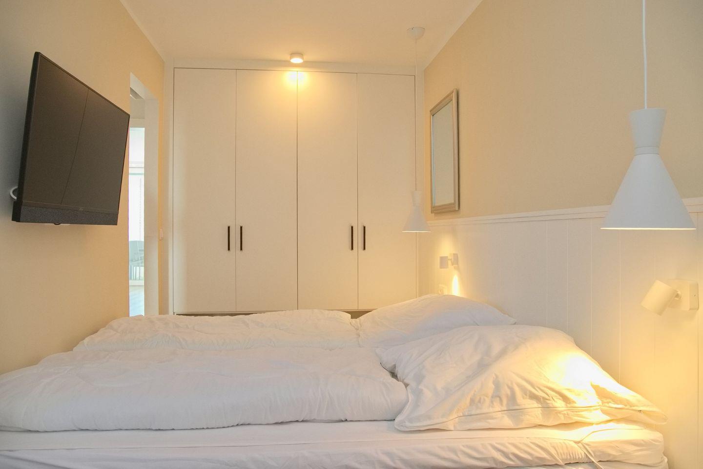 Das modern gestaltete Schlafzimmer ist über zwei Schiebetüren pro Bettseite zugänglich. Es ist mit einem komfortablen Boxspringbett (Liegefläche 180x200 cm) und durchgehendem Topper für erholsamen Schlaf ausgestattet. Ein geräumiger Kleiderschrank bietet viel Stauraum, und auch hier steht ein Flachbildfernseher bereit.