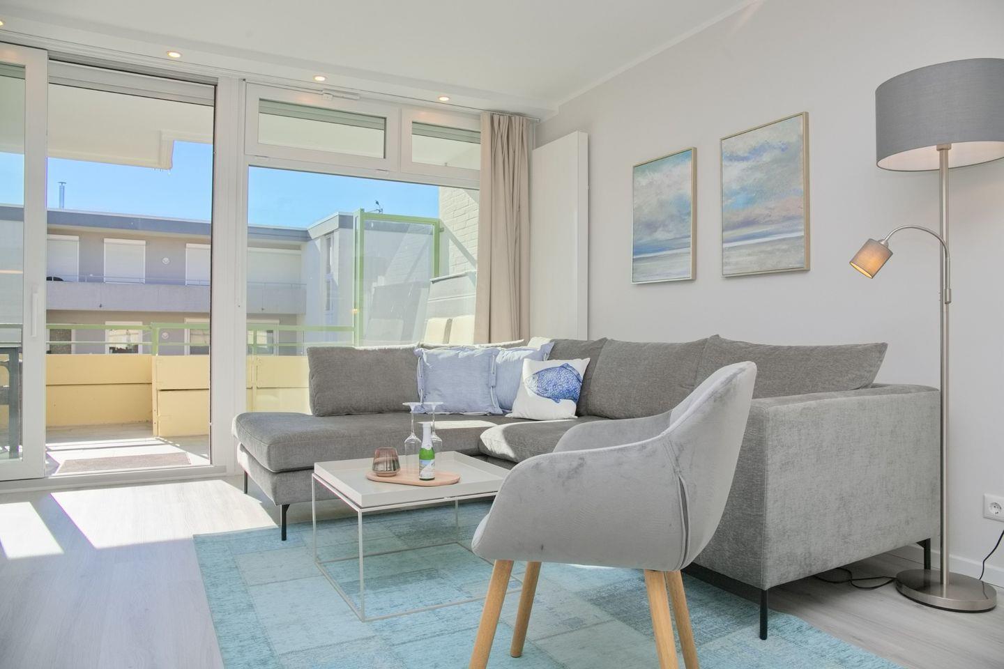 Diese frisch sanierte und neu möblierte 2-Zimmer-Wohnung liegt nur 2 Gehminuten vom Strand entfernt und bietet einen leichten "Teilseeblick" in westlicher Ausrichtung – perfekt, um die Abendsonne zu genießen. Auf dem gemütlichen Balkon können Sie entspannen und die frische Meeresbrise spüren.