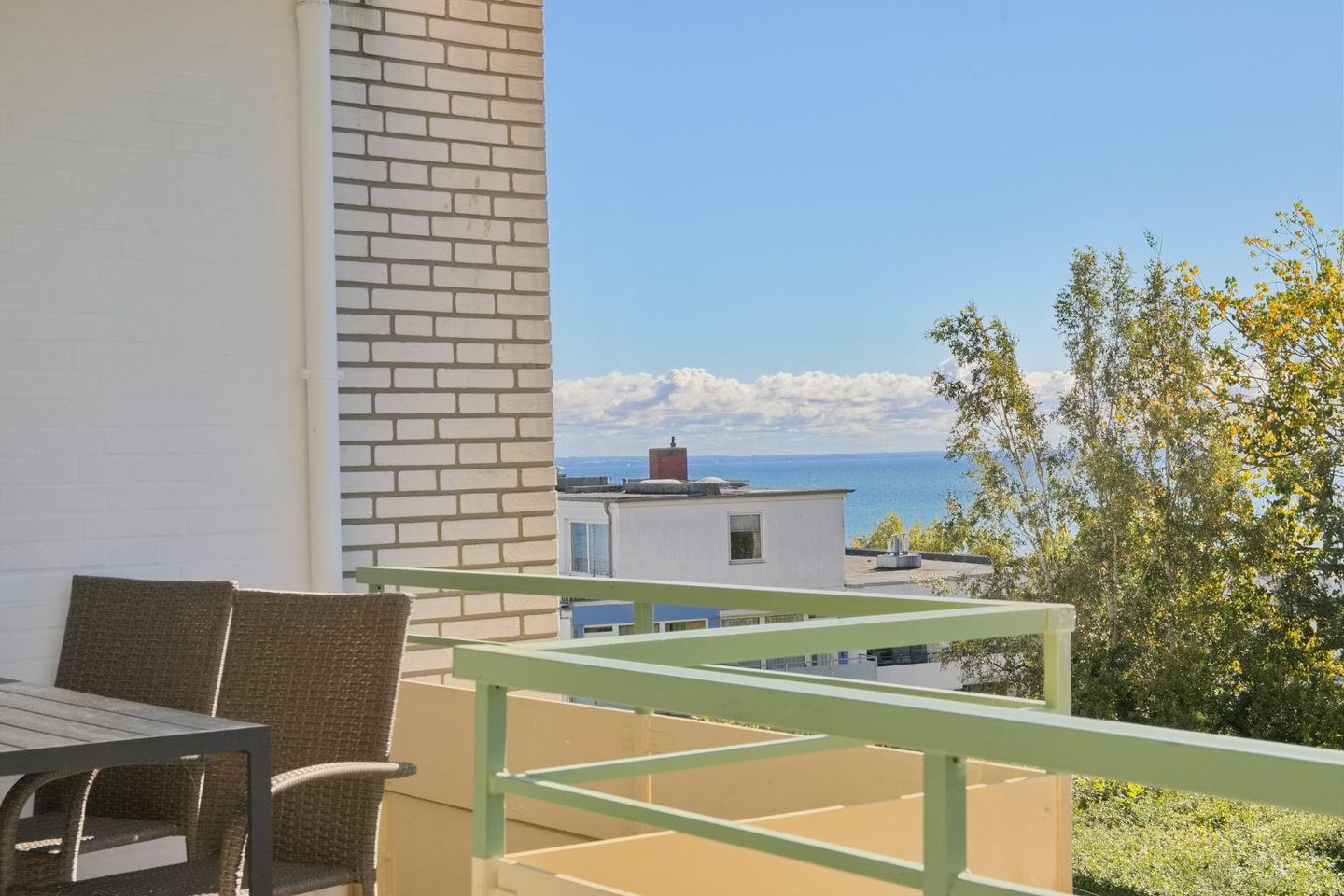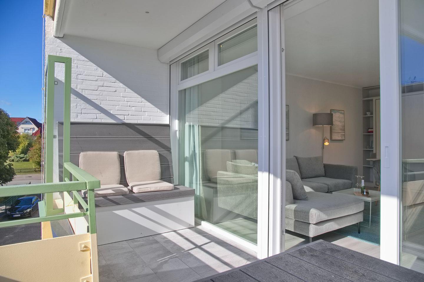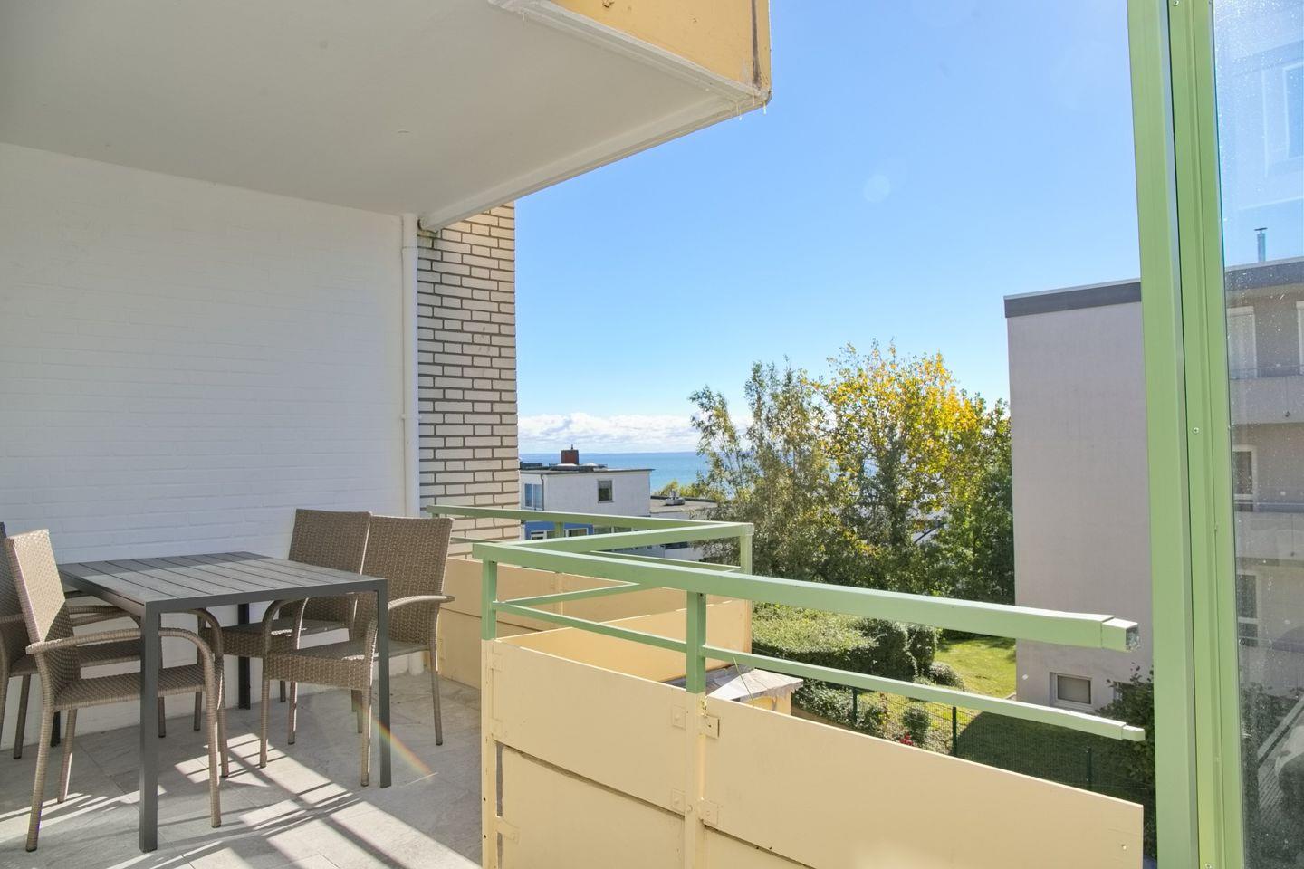 Frisch sanierte 2-Zimmer-Ferienwohnung mit Teilseeblick und Balkon, nur 2 Gehminuten vom Strand in Grömitz entfernt.